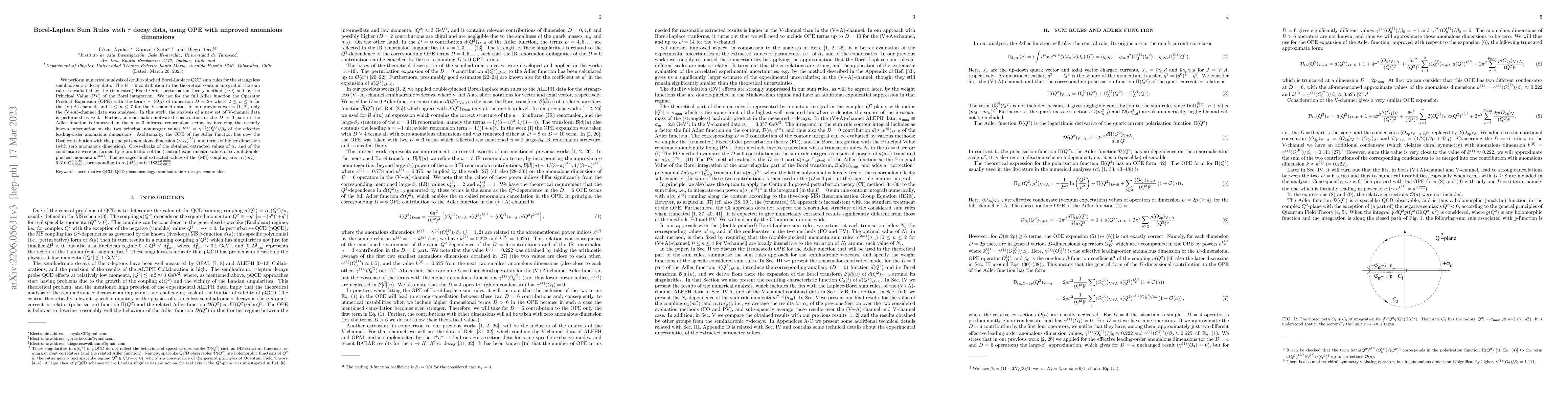 This paper numerically analyzes double-pinched Borel-Laplace QCD sum rules for $\tau$ decay data, incorporating improved anomalous dimensions and Operator Product Expansion (OPE). The study extends previous work by analyzing new V-channel data and refining the $D=0$ part of the Adler function with enhanced infrared renormalon considerations.