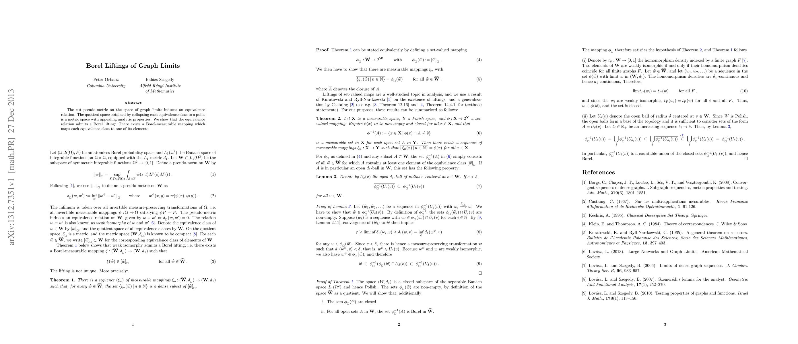 The cut pseudo-metric on the space of graph limits induces an equivalence relation. The quotient space obtained by collapsing each equivalence class to a point is a metric space with appealing analytic properties. We show that the equivalence relation admits a Borel lifting: There exists a Borel-measurable mapping which maps each equivalence class to one of its elements.