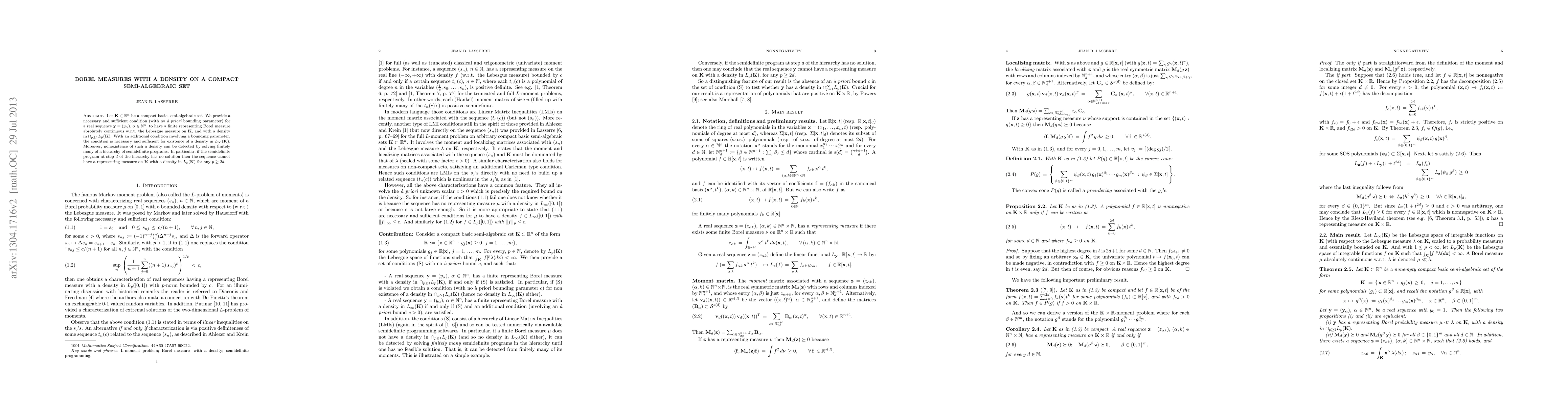 Let $K\subset R^n$ be a compact basic semi-algebraic set. We provide a necessary and sufficient condition (with no a priori bounding parameter) for a real sequence $y=(y_\alpha)$, $\alpha\in N^n$, to have a finite representing Borel measure absolutely continuous w.r.t. the Lebesgue measure on $K$, and with a density in $\cap_{p=1}^\infty L_p(K)$. With an additional condition involving a bounding parameter, the condition is necessary and sufficient for existence of a density in $L_\infty(K)$. Moreover, nonexistence of such a density can be detected by solving finitely many of a hierarchy of semidefinite programs. In particular, if the semidefinite program at step $d$ of the hierarchy has no solution then the sequence cannot have a representing measure on $K$ with a density in $L_p(K)$ for any $p\geq 2d$.