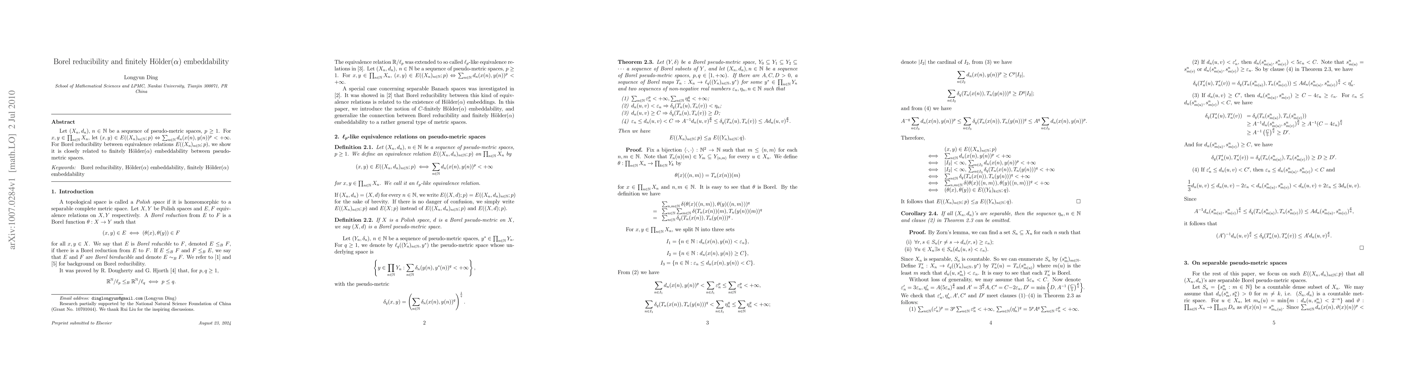 Let $(X_n,d_n),\,n\in\Bbb N$ be a sequence of pseudo-metric spaces, $p\ge 1$. For $x,y\in\prod_{n\in\Bbb N}X_n$, let $(x,y)\in E((X_n)_{n\in\Bbb N};p)\Leftrightarrow\sum_{n\in\Bbb N}d_n(x(n),y(n))^p<+\infty$. For Borel reducibility between equivalence relations $E((X_n)_{n\in\Bbb N};p)$, we show it is closely related to finitely H\"older($\alpha$) embeddability between pseudo-metric spaces.