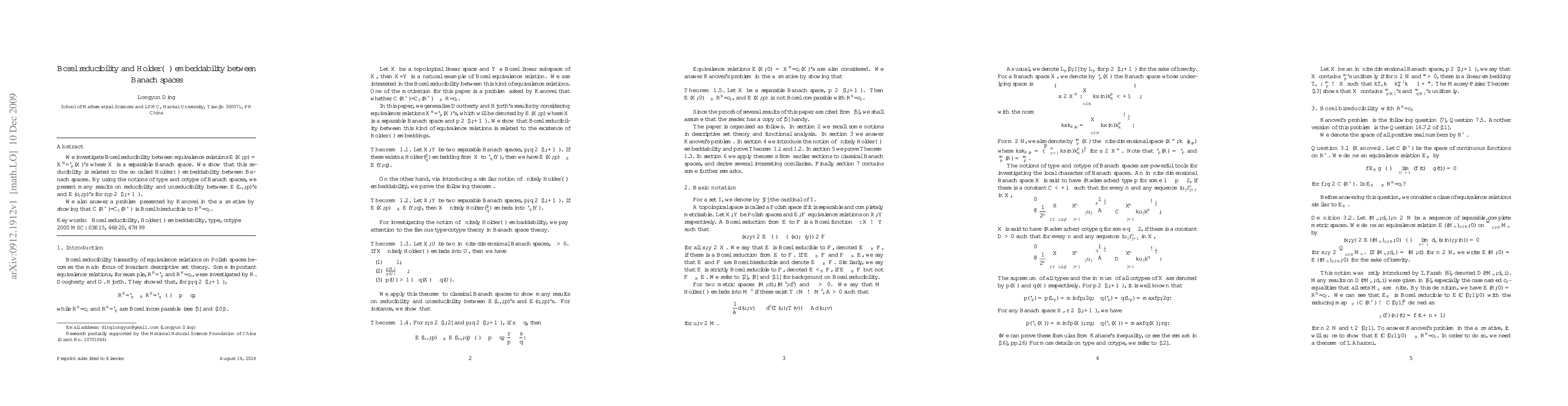 We investigate Borel reducibility between equivalence relations $E(X,p)=X^{\Bbb N}/\ell_p(X)$'s where $X$ is a separable Banach space. We show that this reducibility is related to the so called H\"older$(\alpha)$ embeddability between Banach spaces. By using the notions of type and cotype of Banach spaces, we present many results on reducibility and unreducibility between $E(L_r,p)$'s and $E(c_0,p)$'s for $r,p\in[1,+\infty)$. We also answer a problem presented by Kanovei in the affirmative by showing that $C({\Bbb R}^+)/C_0({\Bbb R}^+)$ is Borel bireducible to ${\Bbb R}^{\Bbb N}/c_0$.