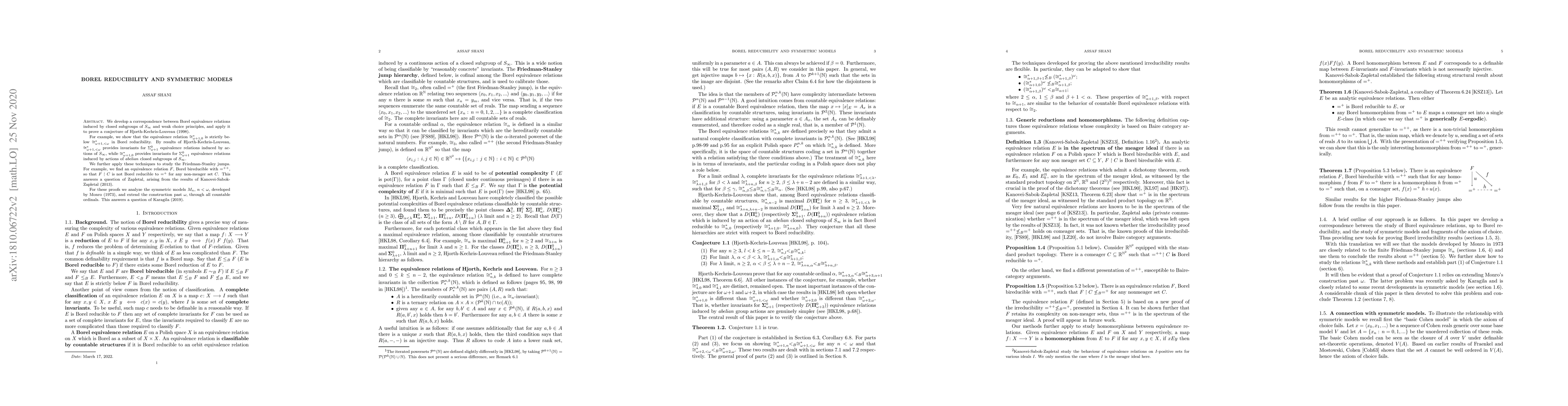 We develop a correspondence between the study of Borel equivalence relations induced by closed subgroups of $S_\infty$, and the study of symmetric models and weak choice principles, and apply it to prove a conjecture of Hjorth-Kechris-Louveau (1998). For example, we show that the equivalence relation $\cong^\ast_{\omega+1,0}$ is strictly below $\cong^\ast_{\omega+1,<\omega}$ in Borel reducibility. By results of Hjorth-Kechris-Louveau, $\cong^\ast_{\omega+1,<\omega}$ provides invariants for $\Sigma^0_{\omega+1}$ equivalence relations induced by actions of $S_\infty$, while $\cong^\ast_{\omega+1,0}$ provides invariants for $\Sigma^0_{\omega+1}$ equivalence relations induced by actions of abelian closed subgroups of $S_\infty$. We further apply these techniques to study the Friedman-Stanley jumps. For example, we find an equivalence relation $F$, Borel bireducible with $=^{++}$, so that $F\restriction C$ is not Borel reducible to $=^{+}$ for any non-meager set $C$. This answers a question of Zapletal, arising from the results of Kanovei-Sabok-Zapletal (2013). For these proofs we analyze the symmetric models $M_n$, $n<\omega$, developed by Monro (1973), and extend the construction past $\omega$, through all countable ordinals. This answers a question of Karagila (2019).