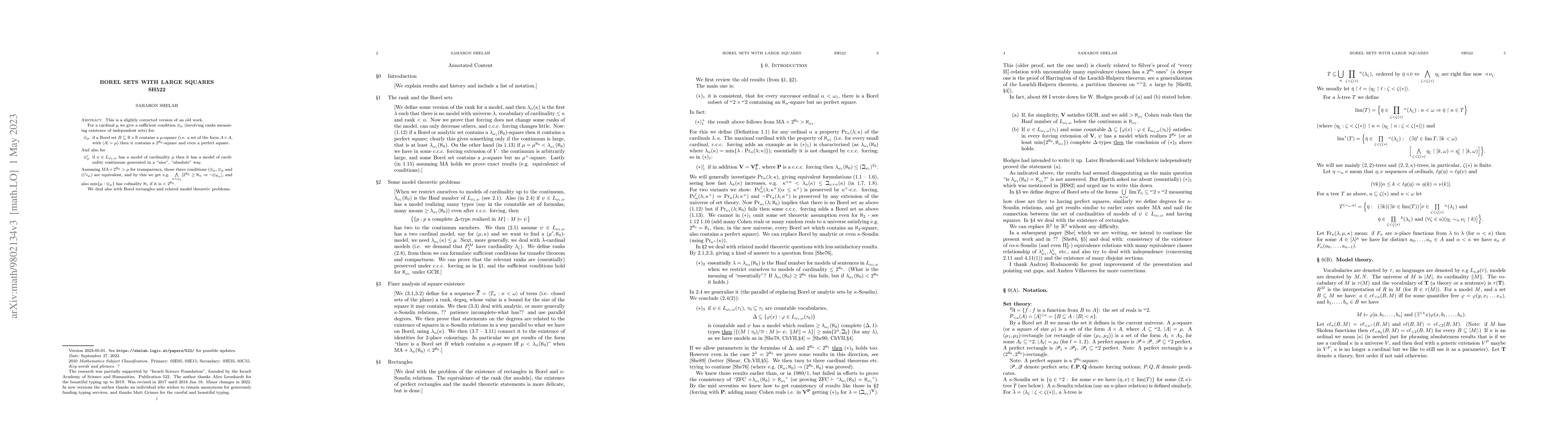 This is a slightly corrected version of an old work. For a cardinal $\mu$ we give a sufficient condition $\oplus_\mu$ (involving ranks measuring existence of independent sets) for: $\otimes_\mu$ if a Borel set $B\subseteq \mathbb{R} \times \mathbb{R}$ contains a $\mu$-square (i.e. a set of the form $A \times A$, with $|A| =\mu)$ then it contains a $2^{\aleph_0}$-square and even a perfect square. And also for $\otimes'_\mu$ if $\psi\in L_{\omega_1, \omega}$ has a model of cardinality $\mu$ then it has a model of cardinality continuum generated in a ``nice", ``absolute" way. Assuming $\mathrm{MA}+ 2^{\aleph_0}>\mu$ for transparency, those three conditions ($\oplus_\mu,\otimes_\mu$ and $\otimes'e_\mu$) are equivalent, and by this we get e.g. $\bigwedge\limits_{\alpha < \omega_1} [2^{\aleph_0} \ge \aleph_\alpha \Rightarrow \neg \otimes_{\aleph_\alpha}$], and also $\min\{\mu: \otimes_\mu\}$ has cofinality $\aleph_1$ if it is $<2^{\aleph_0}$. We deal also with Borel rectangles and related model theoretic problems.