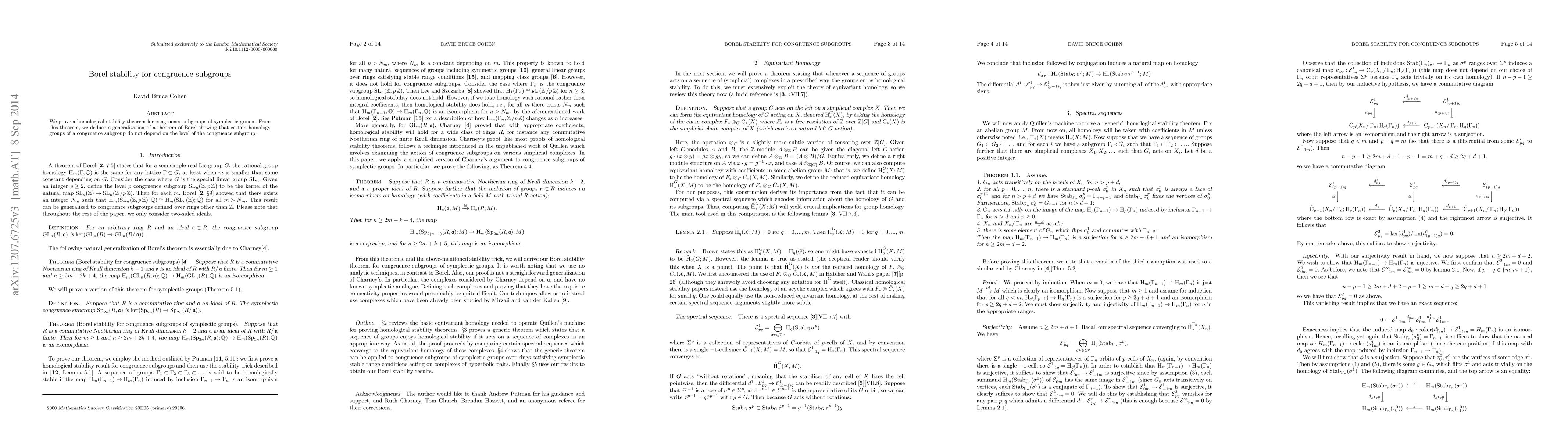 Summary: This paper proves a homological stability theorem for congruence subgroups of symplectic groups, extending Borel's theorem by demonstrating that specific homology groups remain invariant regardless of the subgroup's level.