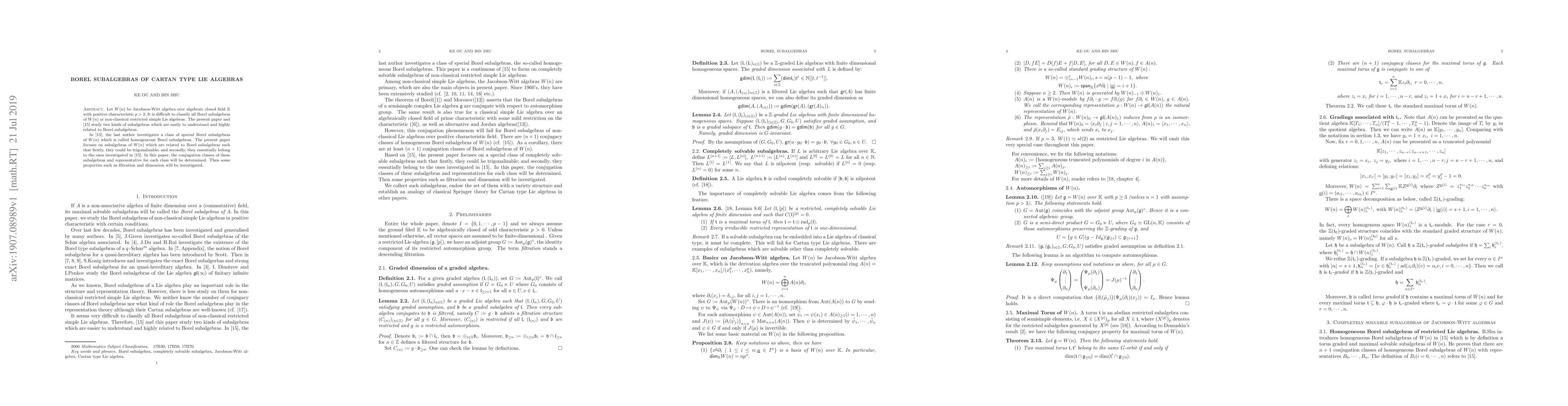 Let $ W(n) $ be Jacobson-Witt algebra over algebraic closed field $ \mathbb{K} $ with positive characteristic $ p>2. $ It is difficult to classify all Borel subalgebras of $ W(n) $ or non-classical restricted simple Lie algebras. The present paper and \cite{S7} study two kinds of subalgebras which are easily to understand and highly related to Borel subalgebras. In \cite{S7}, the last author investigates a class of special Borel subalgebras of $W(n)$ which is called homogeneous Borel subalgebras. The present paper focuses on subalgebras of $ W(n) $ which are related to Borel subalgebras such that firstly, they could be trigonalizable; and secondly, they essentially belong to the ones investigated in \cite{S7}. In this paper, the conjugation classes of these subalgebras and representative for each class will be determined. Then some properties such as filtration and dimension will be investigated.