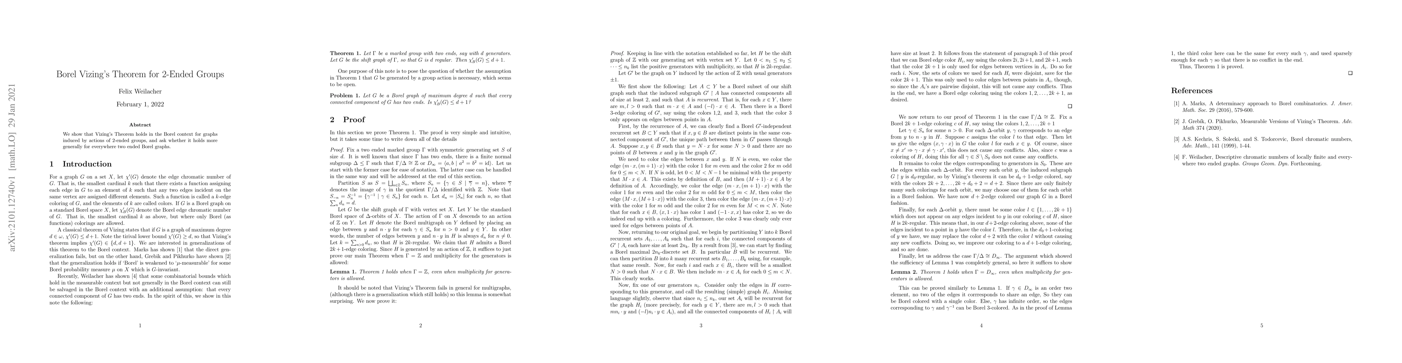 Summary: This paper demonstrates that Vizing's Theorem applies to Borel graphs derived from the actions of 2-ended groups and explores the possibility of its broader applicability to everywhere two-ended Borel graphs.