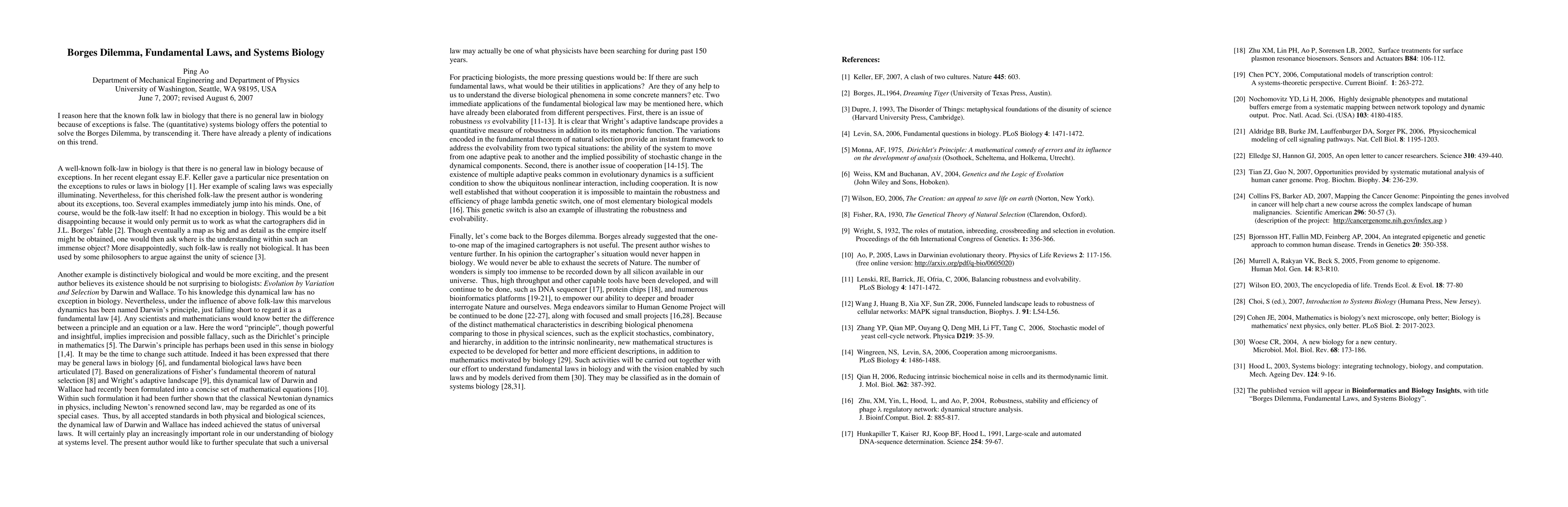 I reason here that the known folk law in biology that there is no general law in biology because of exceptions is false. The (quantitative) systems biology offers the potential to solve the Borges Dilemma, by transcending it. There have already a plenty of indications on this trend.