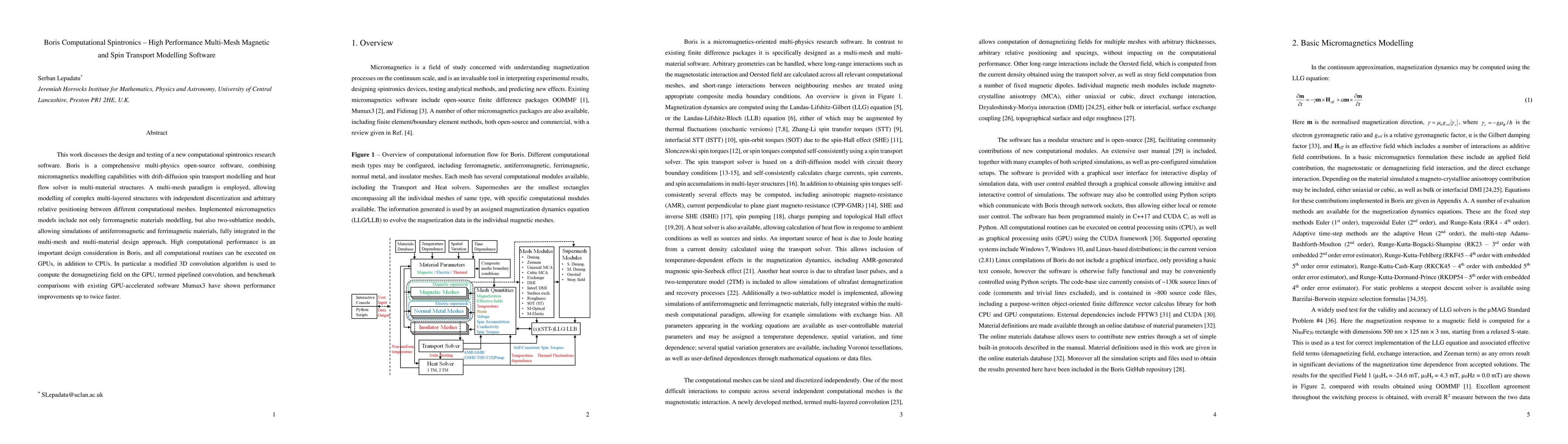 Researchers created Boris, an open-source software for simulating complex magnetic and spin transport in multi-layered structures, achieving performance improvements up to twice faster on GPUs compared to existing alternatives.