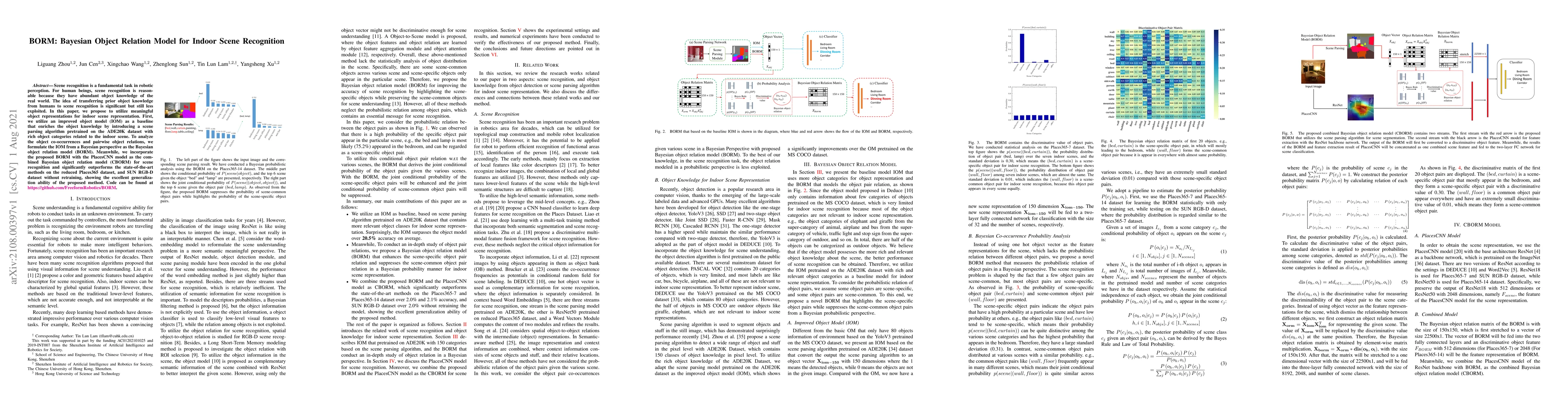 This paper proposes a Bayesian Object Relation Model (BORM) to enhance indoor scene recognition by leveraging prior object knowledge. The method combines an improved object model with a Bayesian framework and integrates it with the PlacesCNN model, achieving superior performance on the Places365 and SUN RGB-D datasets.