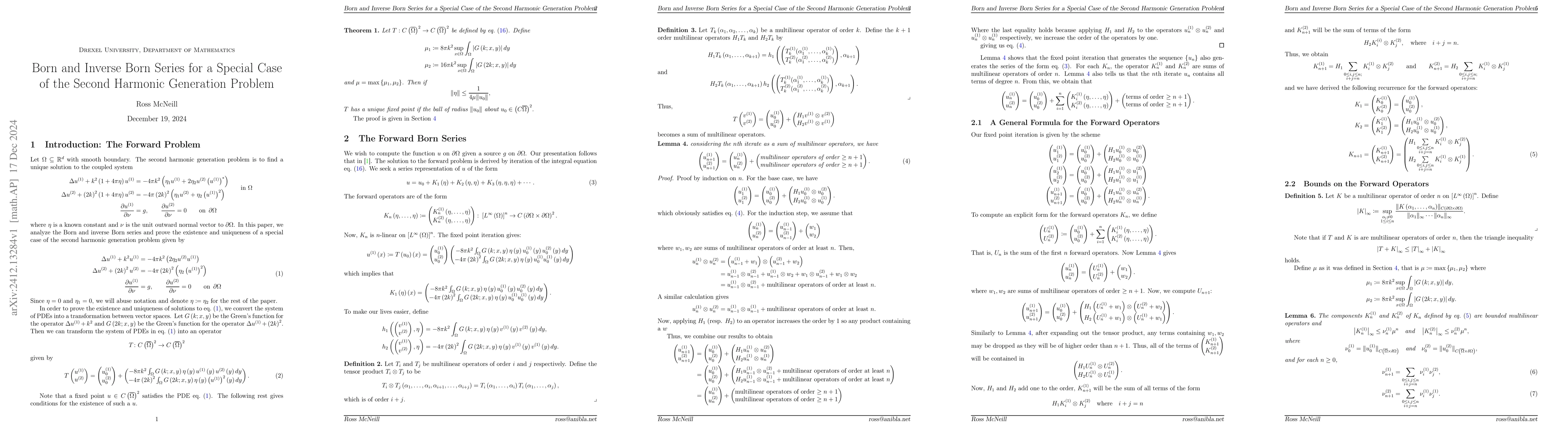 Summary: This paper explores the Born and Inverse Born series for a specific second harmonic generation problem, deriving recursive formulas and proving boundedness conditions for the convergence of these series, alongside employing fixed point theory to provide explicit convergence criteria.