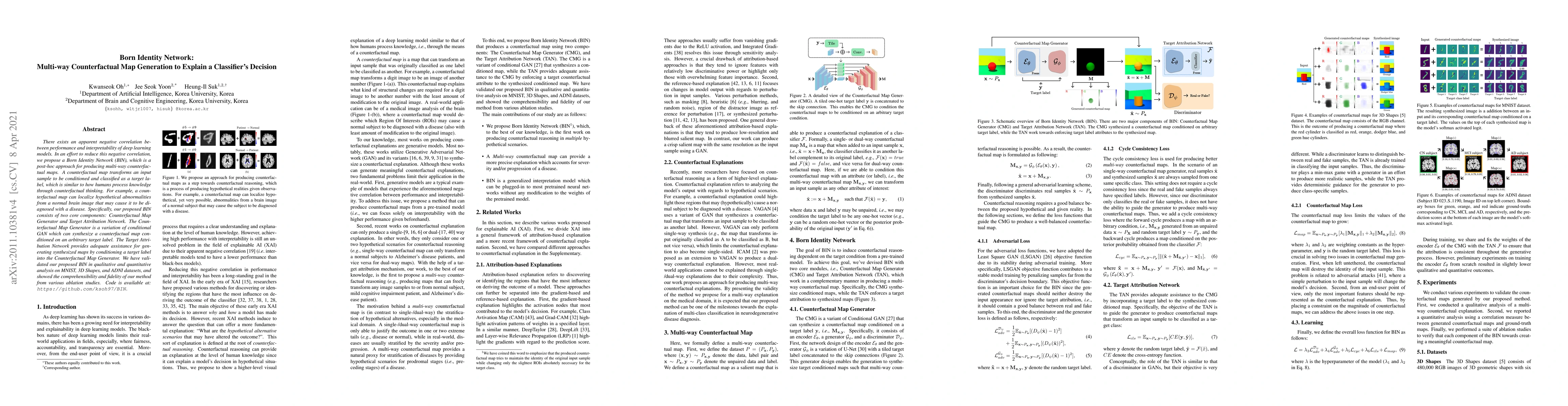 There exists an apparent negative correlation between performance and interpretability of deep learning models. In an effort to reduce this negative correlation, we propose a Born Identity Network (BIN), which is a post-hoc approach for producing multi-way counterfactual maps. A counterfactual map transforms an input sample to be conditioned and classified as a target label, which is similar to how humans process knowledge through counterfactual thinking. For example, a counterfactual map can localize hypothetical abnormalities from a normal brain image that may cause it to be diagnosed with a disease. Specifically, our proposed BIN consists of two core components: Counterfactual Map Generator and Target Attribution Network. The Counterfactual Map Generator is a variation of conditional GAN which can synthesize a counterfactual map conditioned on an arbitrary target label. The Target Attribution Network provides adequate assistance for generating synthesized maps by conditioning a target label into the Counterfactual Map Generator. We have validated our proposed BIN in qualitative and quantitative analysis on MNIST, 3D Shapes, and ADNI datasets, and showed the comprehensibility and fidelity of our method from various ablation studies.