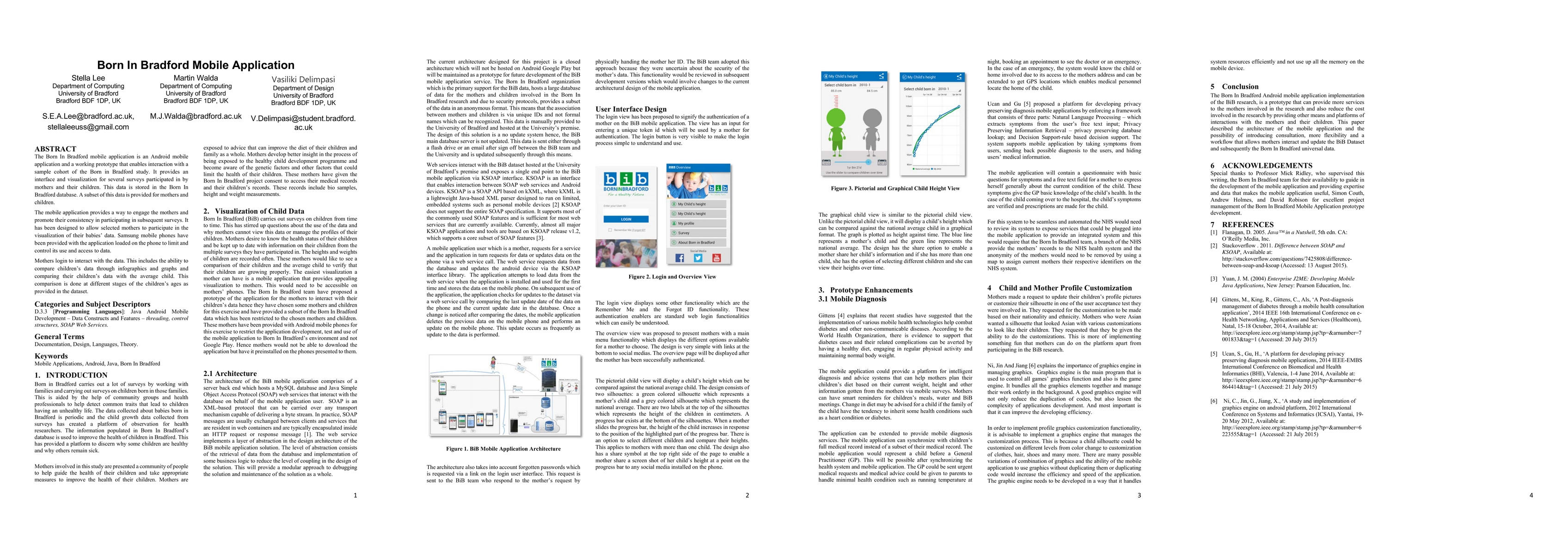 The Born In Bradford mobile application is an Android mobile application and a working prototype that enables interaction with a sample cohort of the Born in Bradford study. It provides an interface and visualization for several surveys participated in by mothers and their children. This data is stored in the Born In Bradford database. A subset of this data is provided for mothers and children. The mobile application provides a way to engage the mothers and promote their consistency in participating in subsequent surveys. It has been designed to allow selected mothers to participate in the visualization of their babies data. Samsung mobile phones have been provided with the application loaded on the phone to limit and control its use and access to data. Mothers login to interact with the data. This includes the ability to compare children data through infographics and graphs and comparing their children data with the average child. This comparison is done at different stages of the children ages as provided in the dataset.