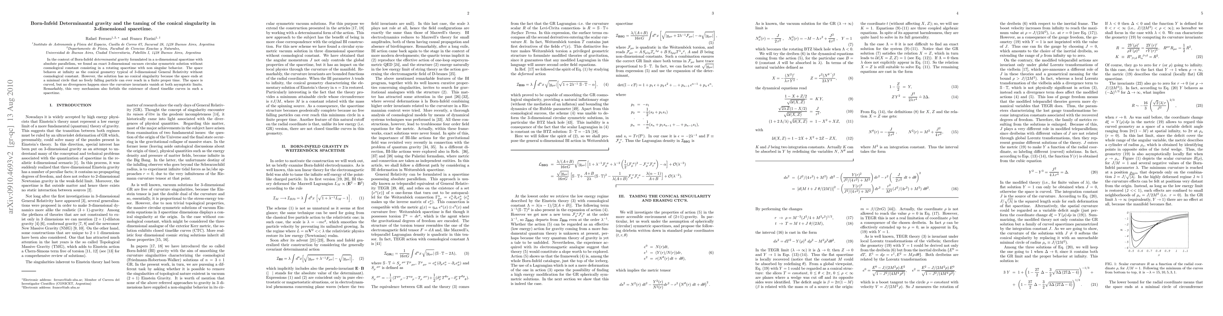 In the context of Born-Infeld \emph{determinantal} gravity formulated in a n-dimensional spacetime with absolute parallelism, we found an exact 3-dimensional \emph{vacuum} circular symmetric solution without cosmological constant consisting in a rotating spacetime with non singular behavior. The space behaves at infinity as the conical geometry typical of 3-dimensional General Relativity without cosmological constant. However, the solution has no conical singularity because the space ends at a minimal circle that no freely falling particle can ever reach in a finite proper time. The space is curved, but no divergences happen since the curvature invariants vanish at both asymptotic limits. Remarkably, this very mechanism also forbids the existence of closed timelike curves in such a spacetime.