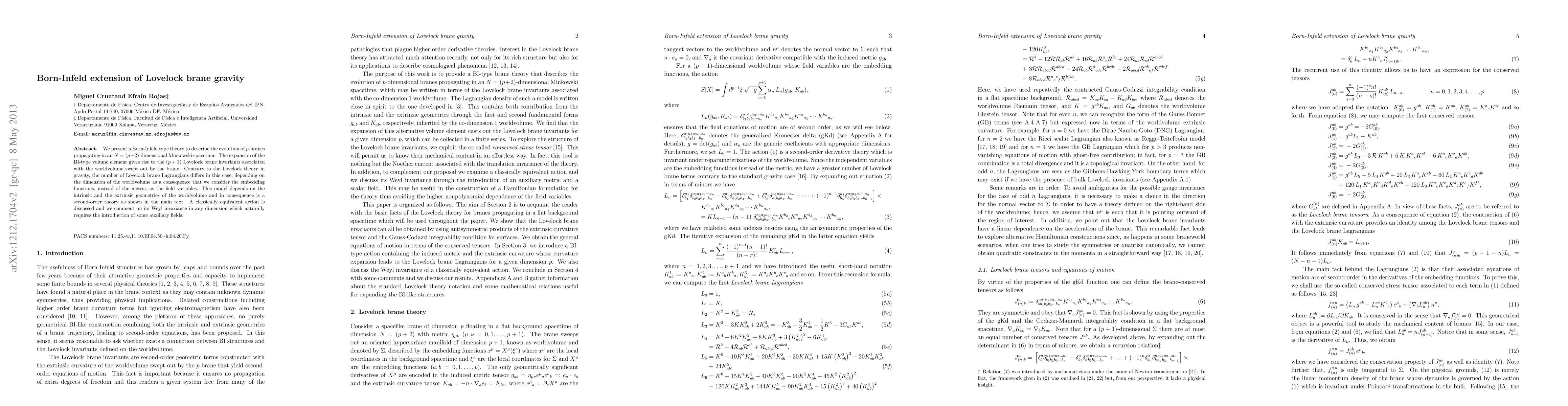 We present a Born-Infeld type theory to describe the evolution of p-branes propagating in an N = (p+2)-dimensional Minkowski spacetime. The expansion of the BI-type volume element gives rise to the (p+1) Lovelock brane invariants associated with the worldvolume swept out by the brane. Contrary to the Lovelock theory in gravity, the number of Lovelock brane Lagrangians differs in this case, depending on the dimension of the worldvolume as a consequence that we consider the embedding functions, instead of the metric, as the field variables. This model depends on the intrinsic and the extrinsic geometries of the worldvolume and in consequence is a second-order theory as shown in the main text. A classically equivalent action is discussed and we comment on its Weyl invariance in any dimension which naturally requires the introduction of some auxiliary fields.