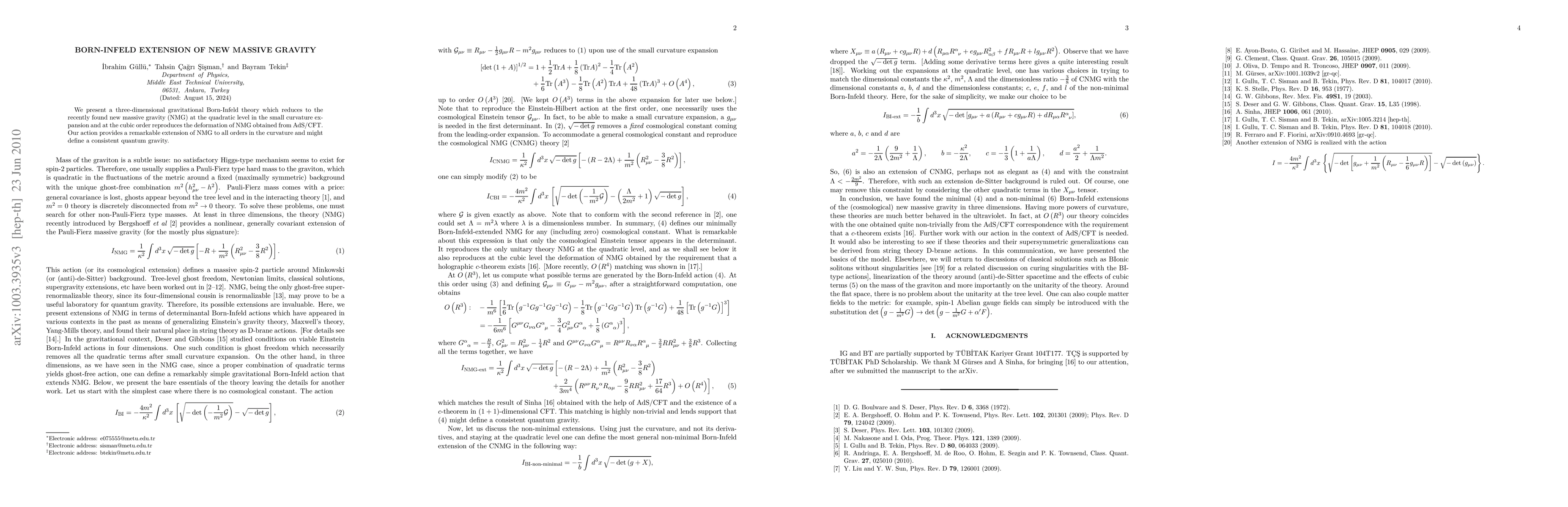 This paper proposes a three-dimensional Born-Infeld extension of New Massive Gravity, which generalizes NMG to all curvature orders, offering a potential framework for consistent quantum gravity. The theory reduces to NMG at quadratic order and reproduces its AdS/CFT deformation at cubic order.