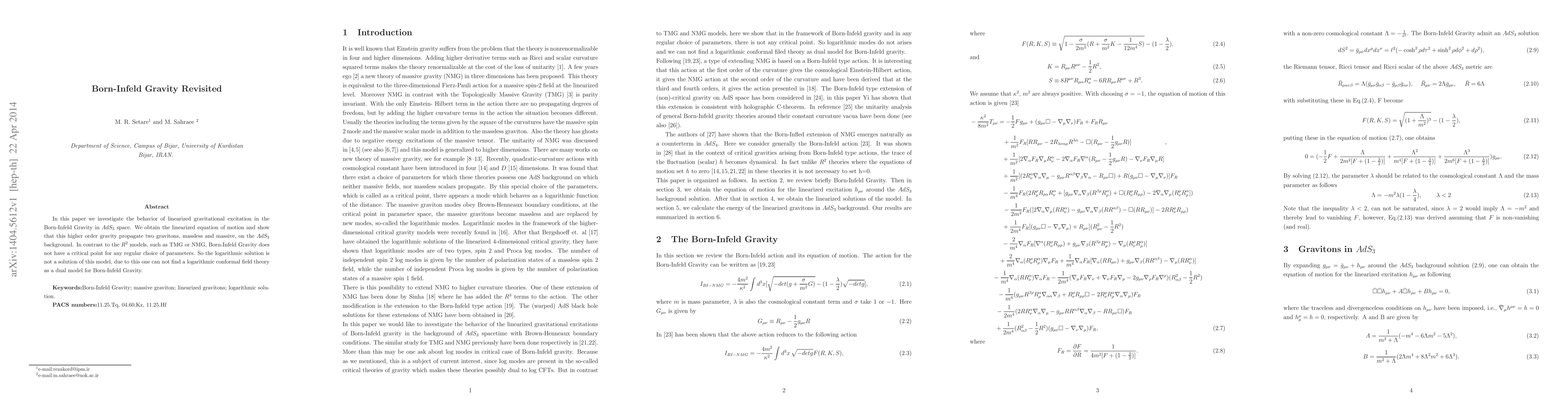 This paper studies linearized gravitational excitations in Born-Infeld Gravity within $AdS_3$ space, revealing that it propagates two types of gravitons—massless and massive. Unlike $R^2$ models, it lacks a critical point for regular parameters, thus excluding the existence of a logarithmic solution or its dual logarithmic conformal field theory.