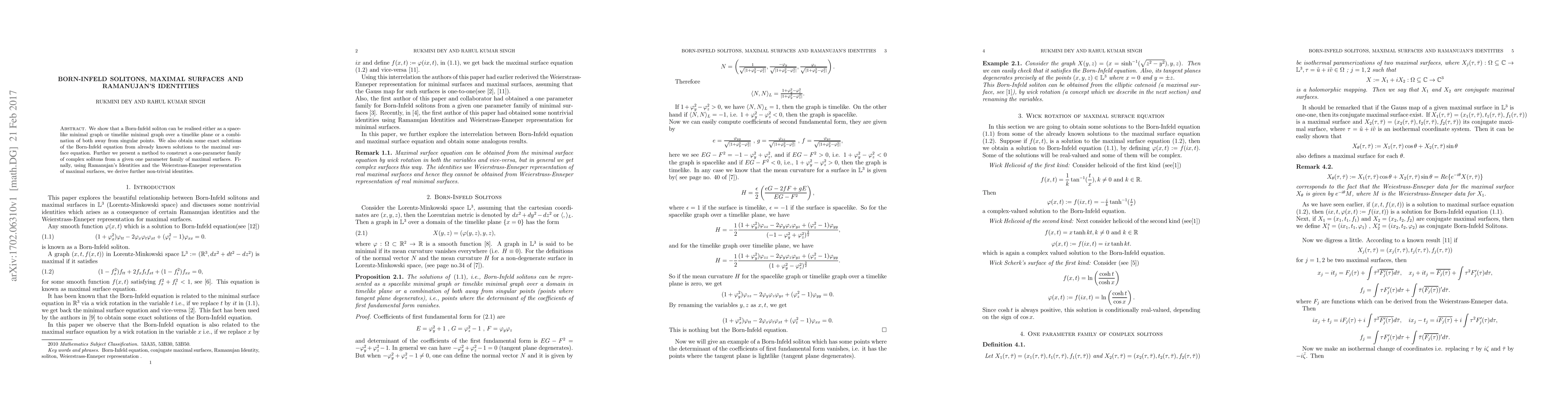 We show that a Born-Infeld soliton can be realised either as a spacelike minimal graph or timelike minimal graph over a timelike plane or a combination of both away from singular points. We also obtain some exact solutions of the Born-Infeld equation from already known solutions to the maximal surface equation. Further we present a method to construct a one-parameter family of complex solitons from a given one parameter family of maximal surfaces. Finally, using Ramanujan's Identities and the Weierstrass-Enneper representation of maximal surfaces, we derive further non-trivial identities.