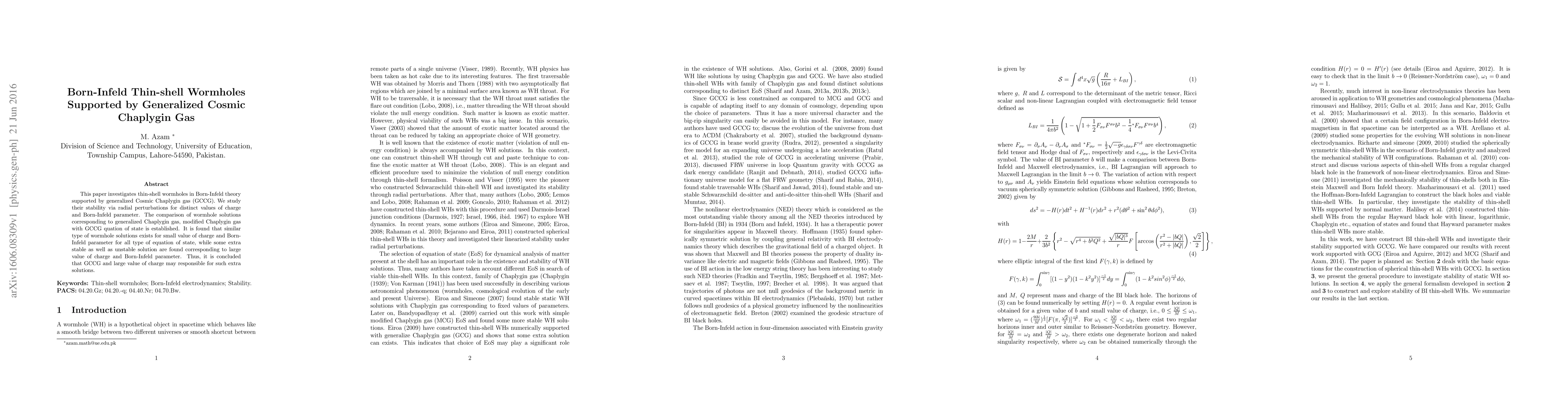This paper investigates thin-shell wormholes in Born-Infeld theory supported by generalized Cosmic Chaplygin gas (GCCG). We study their stability via radial perturbations for distinct values of charge and Born-Infeld parameter. The comparison of wormhole solutions corresponding to generalized Chaplygin gas, modified Chaplygin gas with GCCG quation of state is established. It is found that similar type of wormhole solutions exists for small value of charge and Born-Infeld parameter for all type of equation of state, while some extra stable as well as unstable solution are found corresponding to large value of charge and Born-Infeld parameter. Thus, it is concluded that GCCG and large value of charge may responsible for such extra solutions.