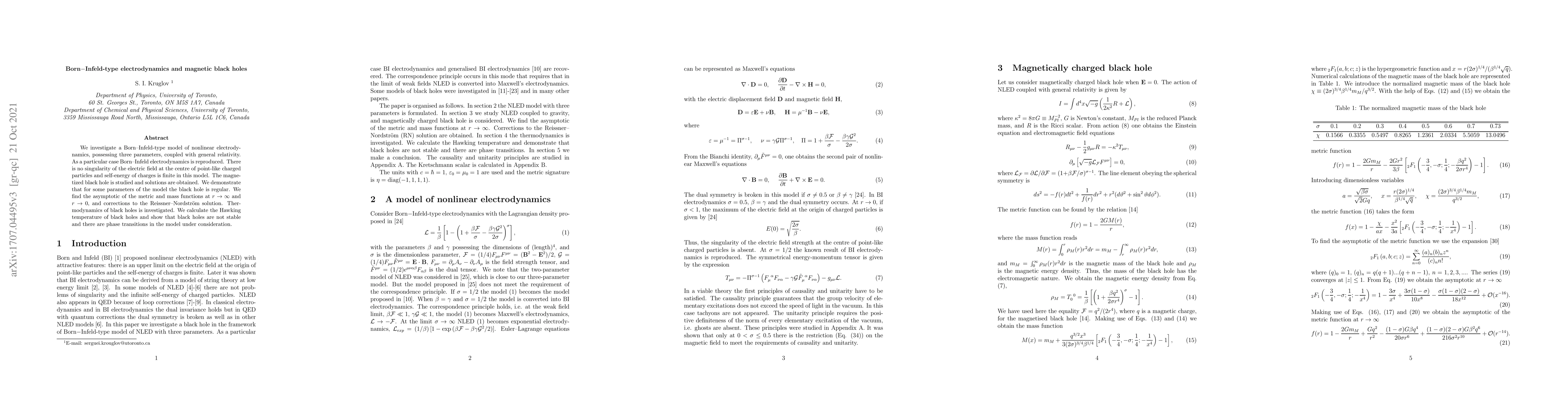 We investigate a Born--Infeld-type model of nonlinear electrodynamics, possessing three parameters, coupled with general relativity. As a particular case Born--Infeld electrodynamics is reproduced. There is no singularity of the electric field at the centre of point-like charged particles and self-energy of charges is finite in this model. The magnetized black hole is studied and solutions are obtained. We demonstrate that for some parameters of the model the black hole is regular. We find the asymptotic of the metric and mass functions at $r\rightarrow\infty$ and $r\rightarrow 0$, and corrections to the Reissner--Nordstr\"{o}m solution. Thermodynamics of black holes is investigated. We calculate the Hawking temperature of black holes and show that black holes are not stable and there are phase transitions in the model under consideration.