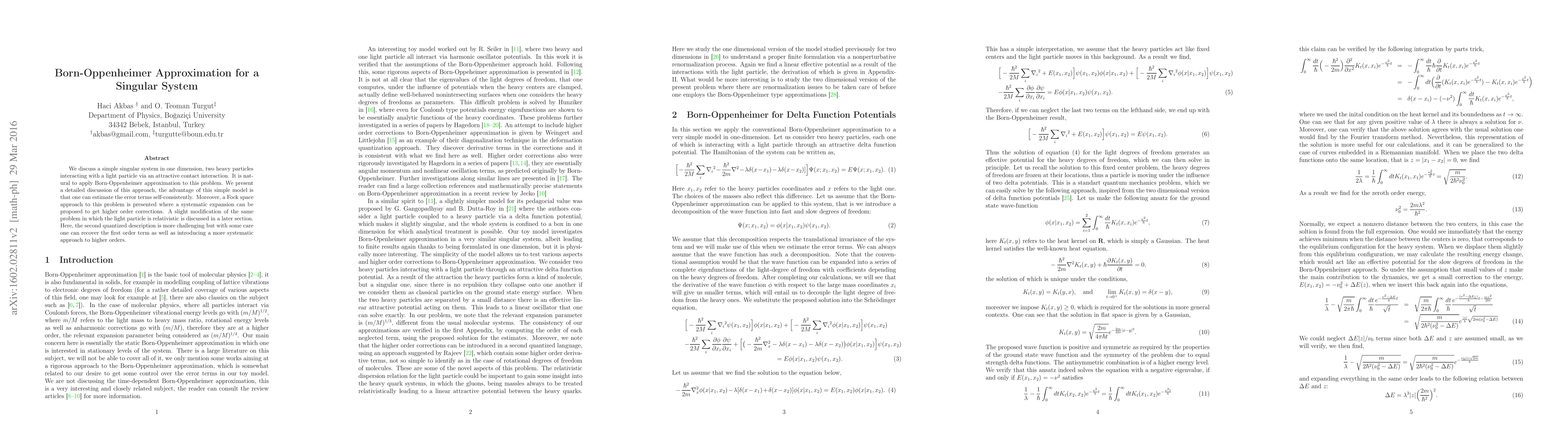 We discuss a simple singular system in one dimension, two heavy particles interacting with a light particle via an attractive contact interaction. It is natural to apply Born-Oppenheimer approximation to this problem. We present a detailed discussion of this approach, the advantage of this simple model is that one can estimate the error terms self-consistently. Moreover, a Fock space approach to this problem is presented where a systematic expansion can be proposed to get higher order corrections. A slight modification of the same problem in which the light particle is relativistic is discussed in a later section. Here, the second quantized description is more challenging but with some care one can recover the first order term as well as introducing a more systematic approach to higher orders.