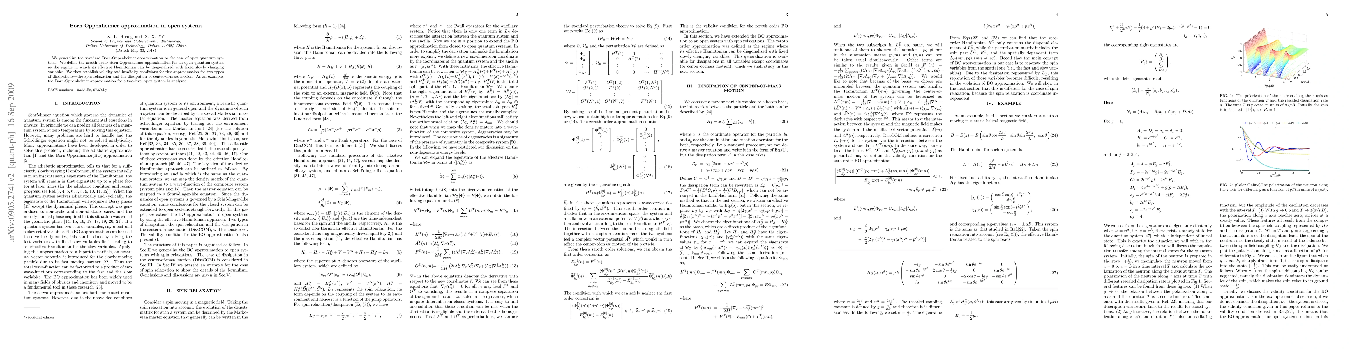 The research generalizes the Born-Oppenheimer approximation to open quantum systems using the effective Hamiltonian approach, defining the zeroth-order approximation as the regime where the effective Hamiltonian can be diagonalized with fixed slowly changing variables. Validity and invalidity conditions are established for spin relaxation and center-of-mass motion dissipation.