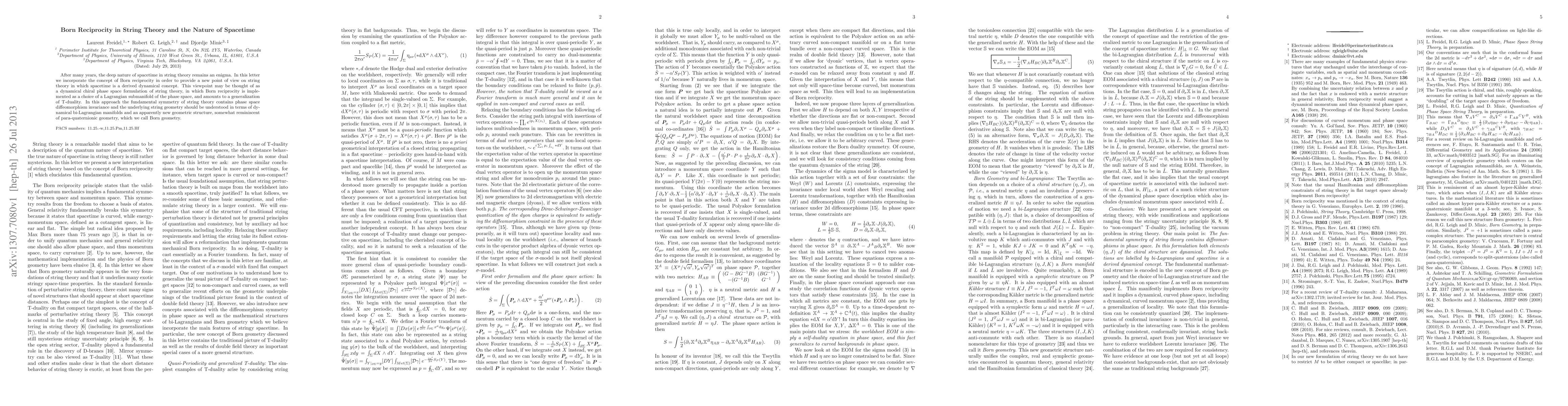 This paper proposes a new perspective on string theory by integrating Born reciprocity, suggesting that spacetime emerges dynamically rather than being fundamental. It introduces Born geometry, a novel geometric structure akin to para-quaternionic geometry, which generalizes T-duality and redefines string theory in terms of bi-Lagrangian manifolds.