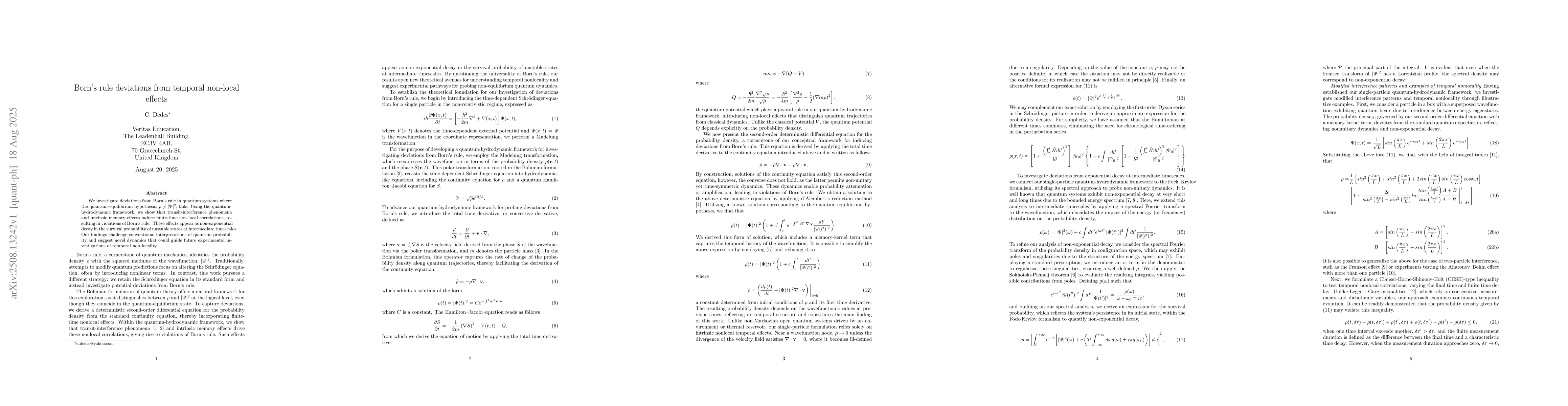 We investigate deviations from Born's rule in quantum systems where the quantum-equilibrium hypothesis, $\rho \neq |\Psi|^2$, fails. Using the quantum-hydrodynamic framework, we show that transit-interference phenomena and intrinsic memory effects induce finite-time non-local correlations, resulting in violations of Born's rule. These effects appear as non-exponential decay in the survival probability of unstable states at intermediate timescales. Our findings challenge conventional interpretations of quantum probability and suggest novel dynamics that could guide future experimental investigations of temporal non-locality.