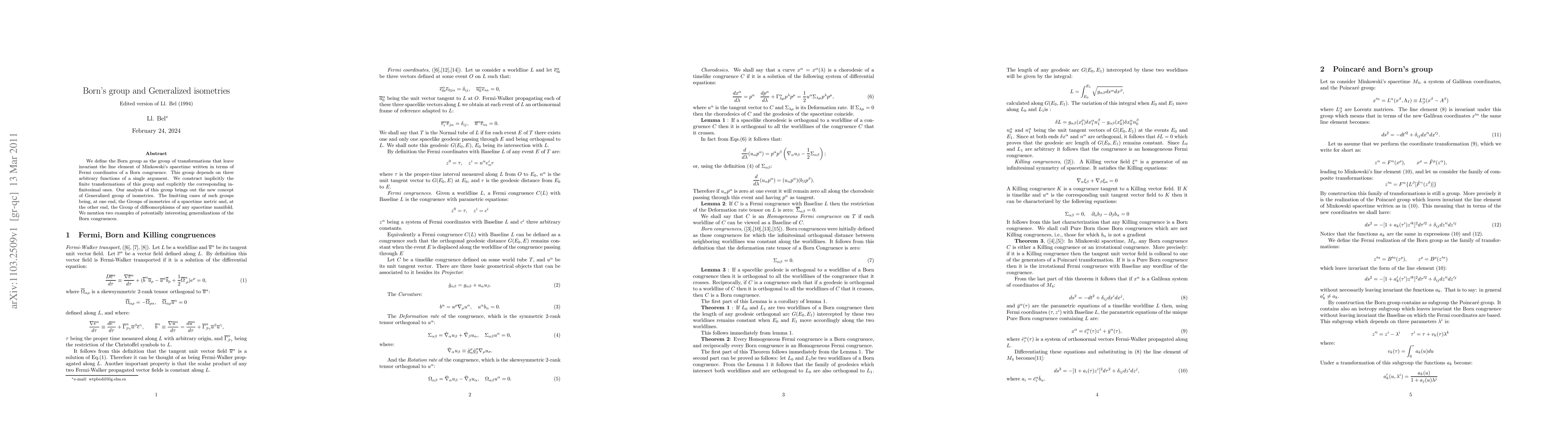 This paper defines the Born group as the set of transformations preserving the Minkowski spacetime line element in Fermi coordinates of a Born congruence, introducing three arbitrary functions. It explores the finite and infinitesimal transformations of this group, leading to the concept of Generalized group of isometries, which bridges spacetime metric isometries and diffeomorphisms.