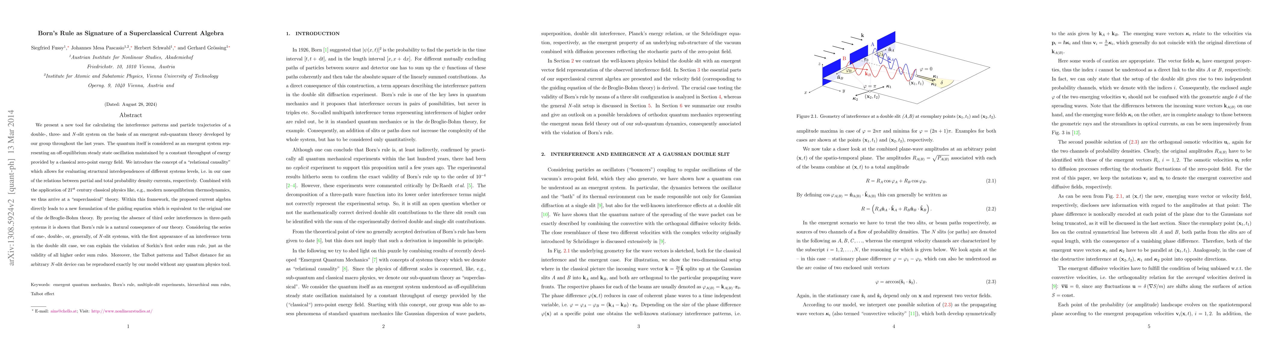 We present a new tool for calculating the interference patterns and particle trajectories of a double-, three- and N-slit system on the basis of an emergent sub-quantum theory developed by our group throughout the last years. The quantum itself is considered as an emergent system representing an off-equilibrium steady state oscillation maintained by a constant throughput of energy provided by a classical zero-point energy field. We introduce the concept of a "relational causality" which allows for evaluating structural interdependences of different systems levels, i.e. in our case of the relations between partial and total probability density currents, respectively. Combined with the application of 21st century classical physics like, e.g., modern nonequilibrium thermodynamics, we thus arrive at a "superclassical" theory. Within this framework, the proposed current algebra directly leads to a new formulation of the guiding equation which is equivalent to the original one of the de Broglie-Bohm theory. By proving the absence of third order interferences in three-path systems it is shown that Born's rule is a natural consequence of our theory. Considering the series of one-, double-, or, generally, of N-slit systems, with the first appearance of an interference term in the double slit case, we can explain the violation of Sorkin's first order sum rule, just as the validity of all higher order sum rules. Moreover, the Talbot patterns and Talbot distance for an arbitrary N-slit device can be reproduced exactly by our model without any quantum physics tool.
