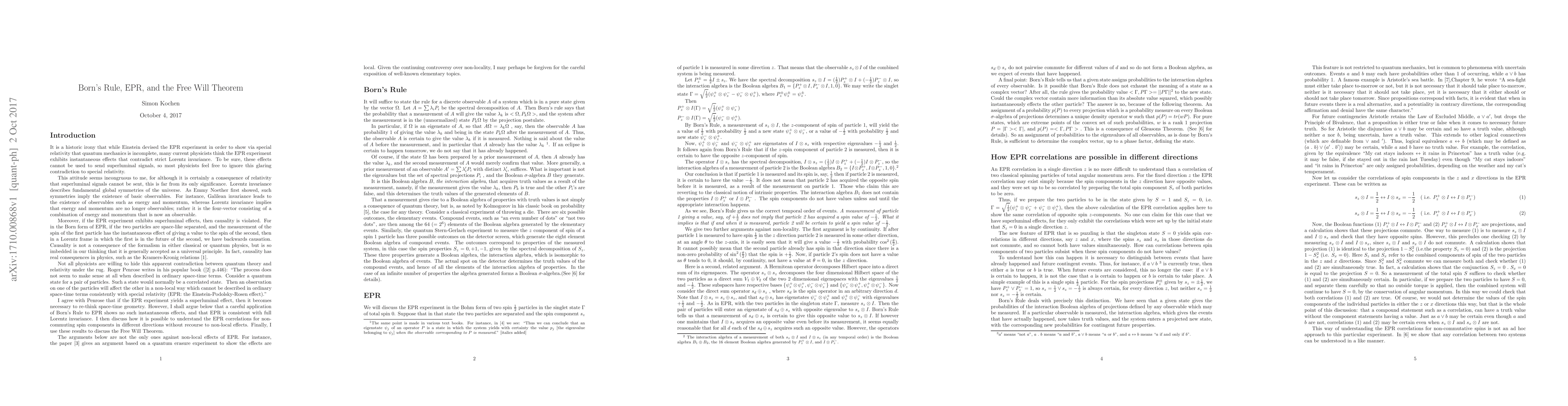 Many physicists believe that the EPR experiment exhibits instantaneous non-local effects. I argue below that an application of Born's Rule to EPR shows no such instantaneous effects and that EPR is consistent with full Lorentz invariance. I then discuss how it is possible to understand the EPR correlations for non-commuting spin components without recourse to non-local effects. Finally, I use these results to discuss the Free Will Theorem, which I formulate in a new way.