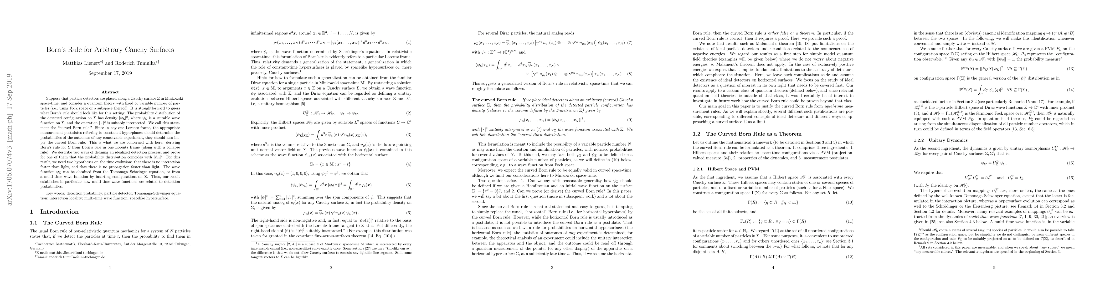 This paper derives Born's rule for quantum theories on arbitrary Cauchy surfaces in Minkowski space-time, establishing that detection probabilities align with $|\psi_\Sigma|^2$, where $\psi_\Sigma$ is a wave function on the surface. The derivation hinges on two hypotheses regarding time evolution and demonstrates the connection between multi-time wave functions and detection probabilities.