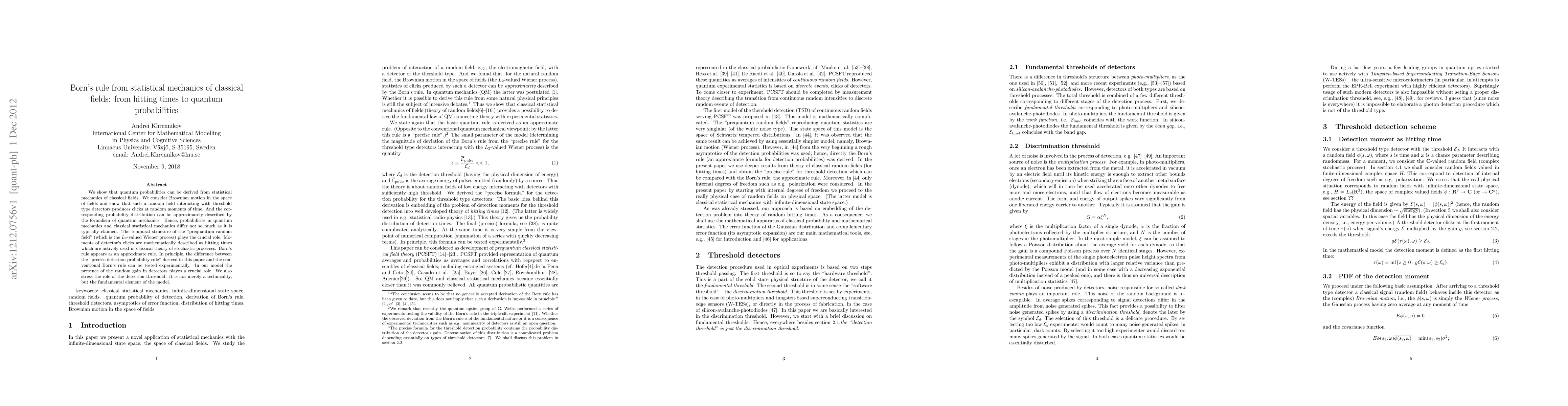 This paper derives quantum probabilities from the statistical mechanics of classical fields, demonstrating that random field interactions with detectors produce clicks whose probability distribution aligns with quantum mechanics. Born's rule emerges as an approximate result, with the detection threshold playing a crucial role in the model.