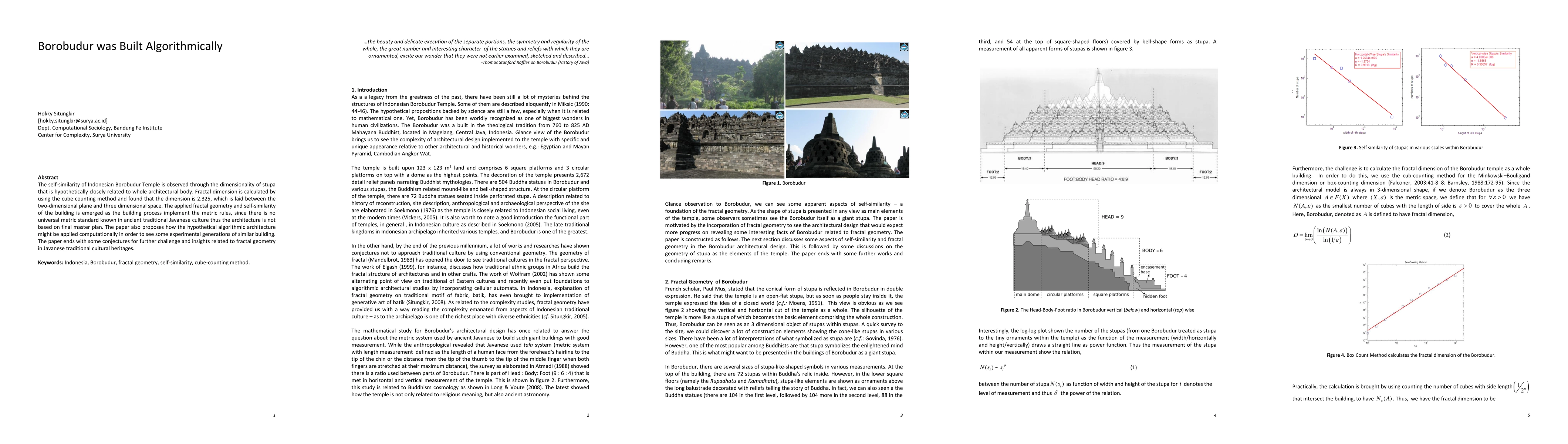 The self-similarity of Indonesian Borobudur Temple is observed through the dimensionality of stupa that is hypothetically closely related to whole architectural body. Fractal dimension is calculated by using the cube counting method and found that the dimension is 2.325, which is laid between the two-dimensional plane and three dimensional space. The applied fractal geometry and self-similarity of the building is emerged as the building process implement the metric rules, since there is no universal metric standard known in ancient traditional Javanese culture thus the architecture is not based on final master plan. The paper also proposes how the hypothetical algorithmic architecture might be applied computationally in order to see some experimental generations of similar building. The paper ends with some conjectures for further challenge and insights related to fractal geometry in Javanese traditional cultural heritages.