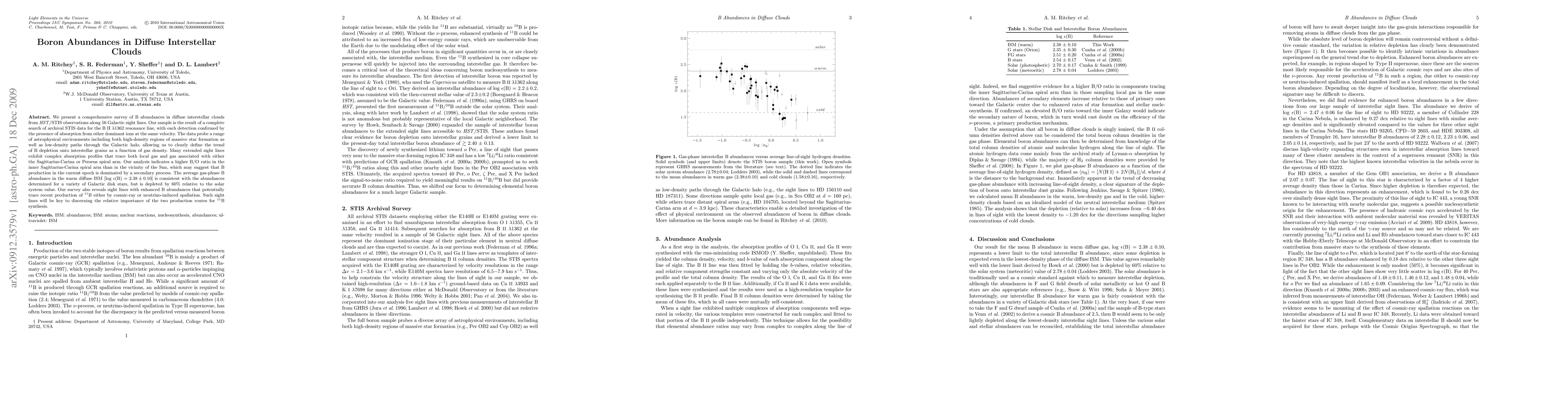 We present a comprehensive survey of B abundances in diffuse interstellar clouds from HST/STIS observations along 56 Galactic sight lines. Our sample is the result of a complete search of archival STIS data for the B II resonance line at 1362 angstroms, with each detection confirmed by the presence of absorption from other dominant ions at the same velocity. The data probe a range of astrophysical environments including both high-density regions of massive star formation as well as low-density paths through the Galactic halo, allowing us to clearly define the trend of B depletion onto interstellar grains as a function of gas density. Many extended sight lines exhibit complex absorption profiles that trace both local gas and gas associated with either the Sagittarius-Carina or Perseus spiral arm. Our analysis indicates a higher B/O ratio in the inner Sagittarius-Carina spiral arm than in the vicinity of the Sun, which may suggest that B production in the current epoch is dominated by a secondary process. The average gas-phase B abundance in the warm diffuse ISM is consistent with the abundances determined for a variety of Galactic disk stars, but is depleted by 60 percent relative to the solar system value. Our survey also reveals sight lines with enhanced B abundances that potentially trace recent production of B-11 either by cosmic-ray or neutrino-induced spallation. Such sight lines will be key to discerning the relative importance of the two production routes for B-11 synthesis.