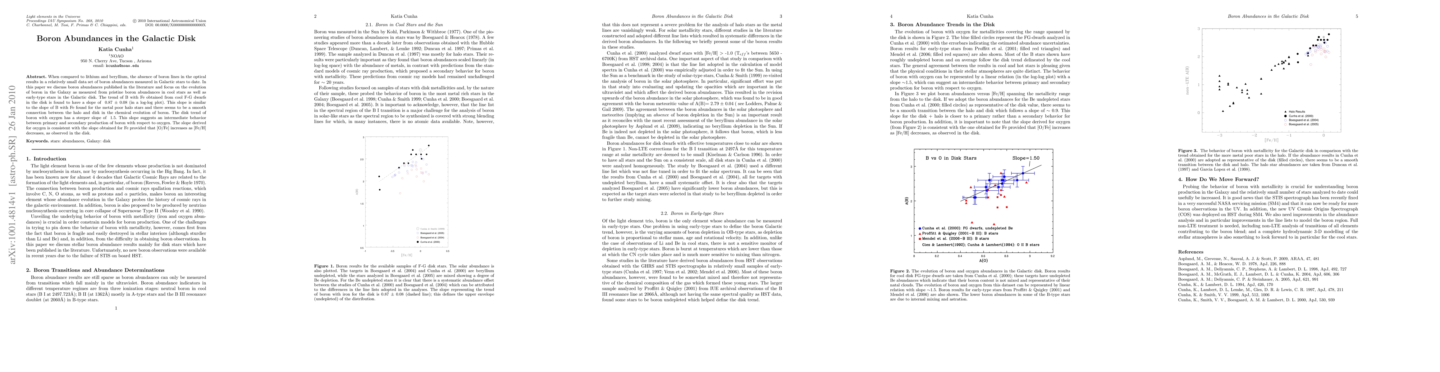 This paper examines boron abundances in Galactic stars, finding a boron-to-iron slope of 0.87 +/- 0.08 in cool F-G dwarfs, indicating a similar trend to metal-poor halo stars, suggesting a smooth chemical evolution connection between the halo and disk. The boron-to-oxygen slope is steeper at ~1.5, implying an intermediate production mechanism between primary and secondary processes.