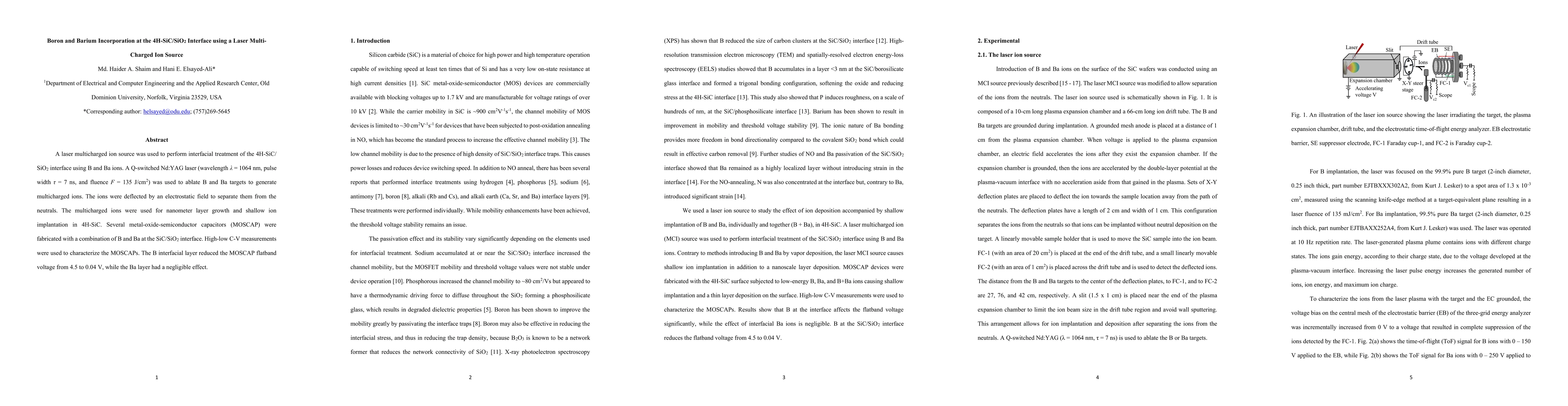This study employs a laser multicharged ion source to incorporate boron and barium at the 4H-SiC/SiO2 interface, achieving significant reduction in MOSCAP flatband voltage through boron treatment. The method uses a Q-switched Nd:YAG laser for ion generation and electrostatic deflection for separation.