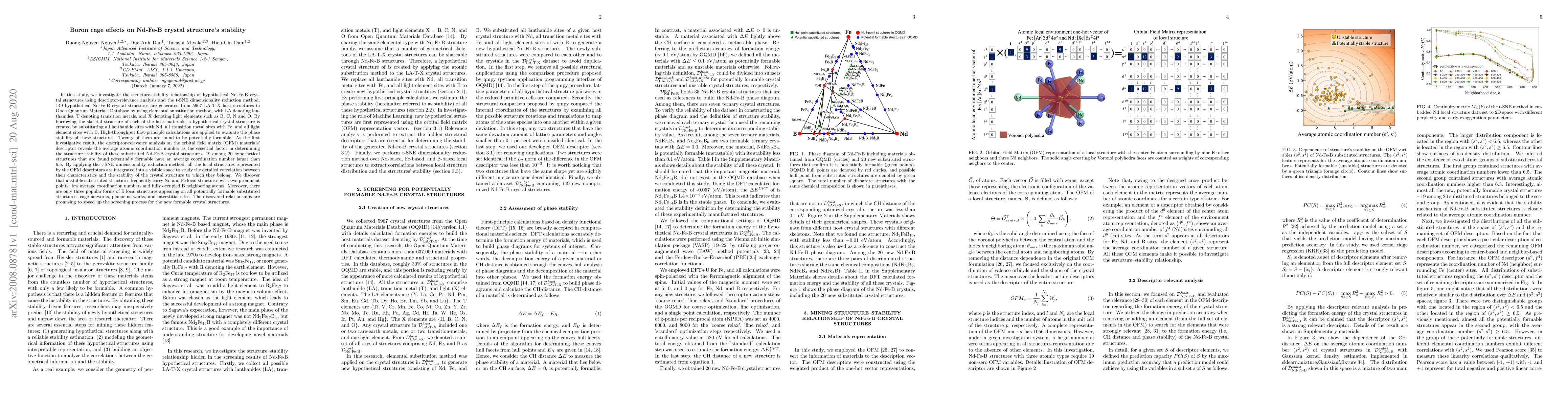 This study explores the stability of hypothetical Nd-Fe-B crystal structures using high-throughput first-principle calculations, revealing that the average atomic coordination number is key to their stability. The analysis identifies boron cage networks as a common feature in potentially formable structures, suggesting this insight could accelerate the discovery of new stable crystal forms.