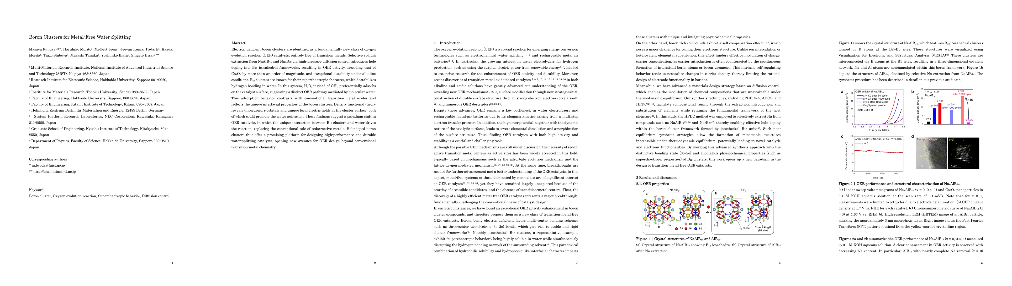 Electron-deficient boron clusters are identified as a fundamentally new class of oxygen evolution reaction (OER) catalysts, entirely free of transition metals. Selective sodium extraction from NaAlB14 and Na2B29 via high-pressure diffusion control introduces hole doping into B12 icosahedral frameworks, resulting in OER activity exceeding that of Co3O4 by more than an order of magnitude, and exceptional durability under alkaline conditions. B12 clusters are known for their superchaotropic character, which destabilizes hydrogen bonding in water. In this system, H2O, instead of OH-, preferentially adsorbs on the catalyst surface, suggesting a distinct OER pathway mediated by molecular water. This adsorption behavior contrasts with conventional transition-metal oxides and reflects the unique interfacial properties of the boron clusters. Density functional theory reveals unoccupied p orbitals and unique local electric fields at the cluster surface, both of which could promote the water activation. These findings suggest a paradigm shift in OER catalysis, in which the unique interaction between B12 clusters and water drives the reaction, replacing the conventional role of redox-active metals. Hole-doped boron clusters thus offer a promising platform for designing high-performance and durable water-splitting catalysts, opening new avenues for OER design beyond conventional transition-metal chemistry.