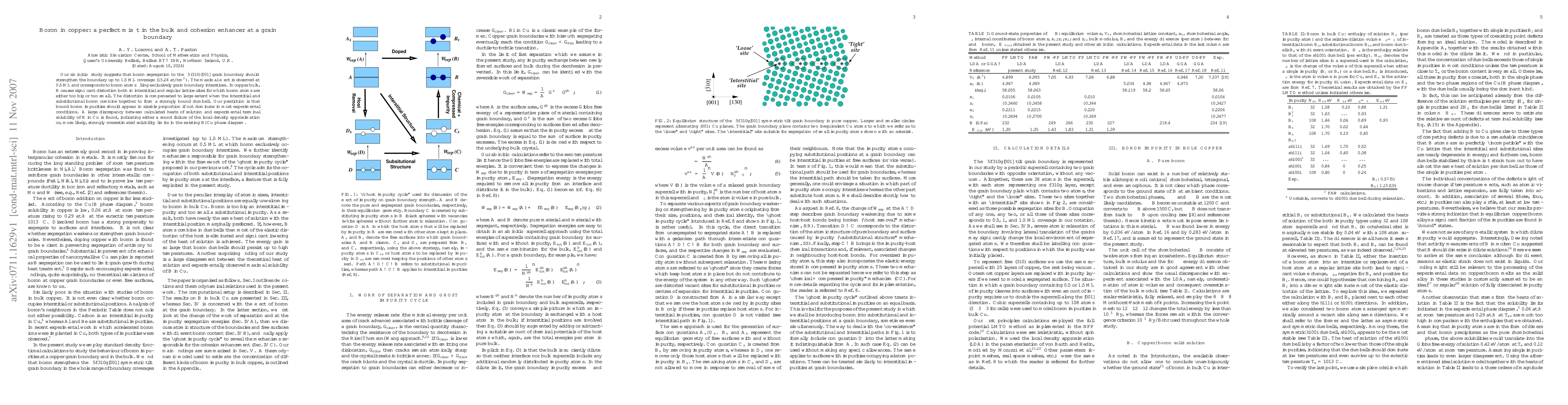 Our ab initio study suggests that boron segregation to the Sigma 5(310)[001] grain boundary should strengthen the boundary up to 1.5 ML coverage (15.24 at/nm^2). The maximal effect is observed at 0.5 ML and corresponds to boron atoms filling exclusively grain boundary interstices. In copper bulk, B causes significant distortion both in interstitial and regular lattice sites for which boron atoms are either too big or too small. The distortion is compensated to large extent when the interstitial and substitutional boron combine together to form a strongly bound dumbell. Our prediction is that bound boron impurities should appear in sizable proportion if not dominate in most experimental conditions. A large discrepancy between calculated heats of solution and experimental terminal solubility of B in Cu is found, indicating either a sound failure of the local density approximation or, more likely, strongly overestimated solubility limits in the existing B-Cu phase diagram.