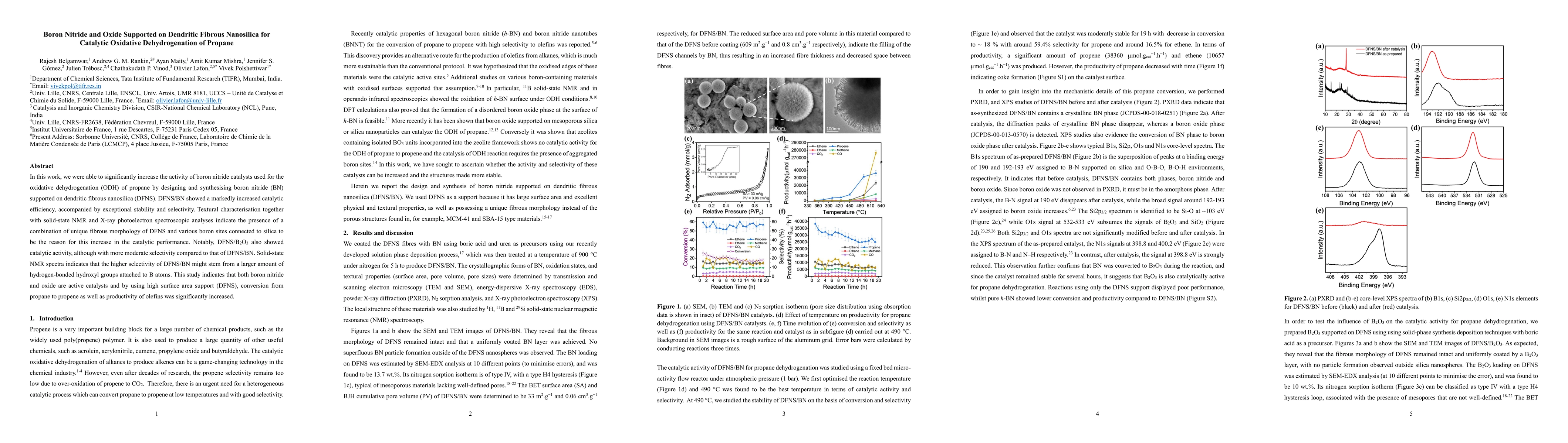 This study enhances the catalytic performance of boron nitride (BN) for propane oxidative dehydrogenation by supporting it on dendritic fibrous nanosilica (DFNS), resulting in improved activity, stability, and selectivity. The unique fibrous morphology and boron sites connected to silica contribute to the increased efficiency, with boron nitride showing superior selectivity compared to boron oxide.