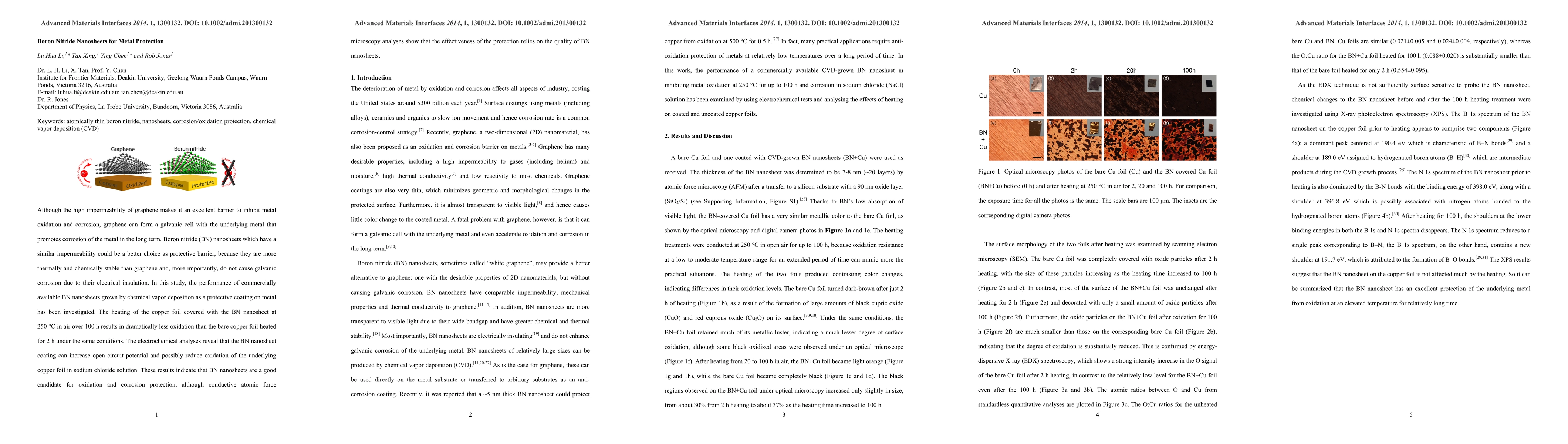 This study investigates boron nitride (BN) nanosheets as a protective barrier against metal oxidation and corrosion, finding they outperform graphene due to better thermal stability, chemical stability, and lack of galvanic corrosion. BN nanosheets significantly reduce copper oxidation when heated in air compared to bare copper.