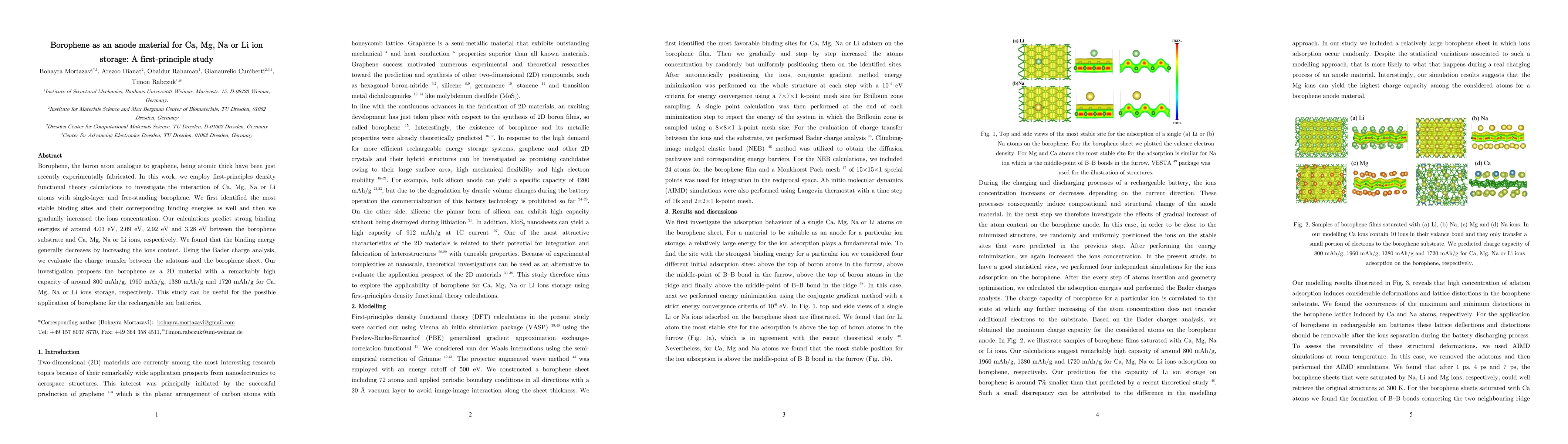 This study uses first-principles calculations to explore borophene's potential as an anode material for Ca, Mg, Na, or Li ion storage, revealing strong binding energies and high storage capacities. The findings suggest borophene could be a promising 2D material for rechargeable ion batteries.