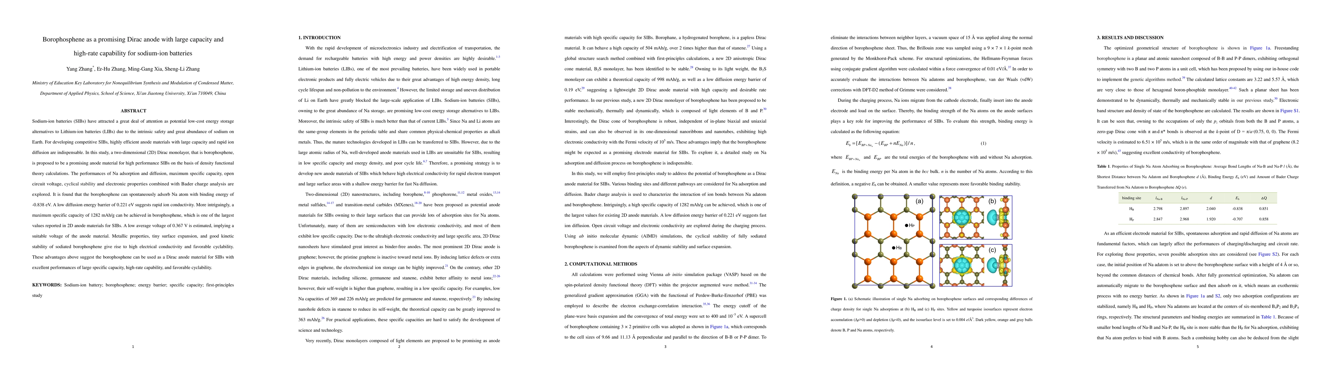 Borophosphene, a two-dimensional Dirac monolayer, shows promising potential as a high-capacity and high-rate anode material for sodium-ion batteries (SIBs), exhibiting a large specific capacity of 1282 mAh/g and rapid sodium diffusion, according to density functional theory calculations.
