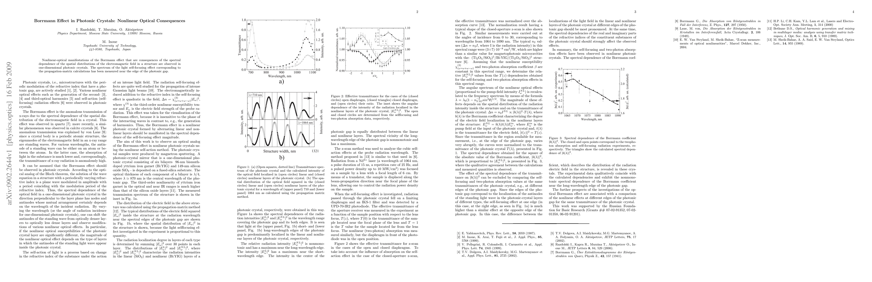 This paper investigates the nonlinear optical effects of the Borrmann effect in one-dimensional photonic crystals, revealing light self-focusing phenomena near the photonic gap edge, as determined by propagation-matrix calculations. The study highlights the spectral dependence on spatial electromagnetic field distributions.