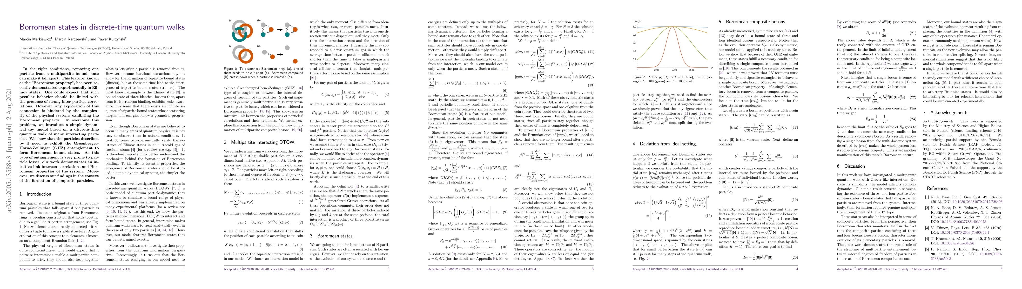 In the right conditions, removing one particle from a multipartite bound state can make it fall apart. This feature, known as the "Borromean property", has been recently demonstrated experimentally in Efimov states. One could expect that such peculiar behavior should be linked with the presence of strong inter-particle correlations. However, any exploration of this connection is hindered by the complexity of the physical systems exhibiting the Borromean property. To overcome this problem, we introduce a simple dynamical toy model based on a discrete-time quantum walk of many interacting particles. We show that the particles described by it need to exhibit the Greenberger-Horne-Zeillinger (GHZ) entanglement to form Borromean bound states. As this type of entanglement is very prone to particle losses, our work demonstrates an intuitive link between correlations and Borromean properties of the system. Moreover, we discuss our findings in the context of the formation of composite particles.