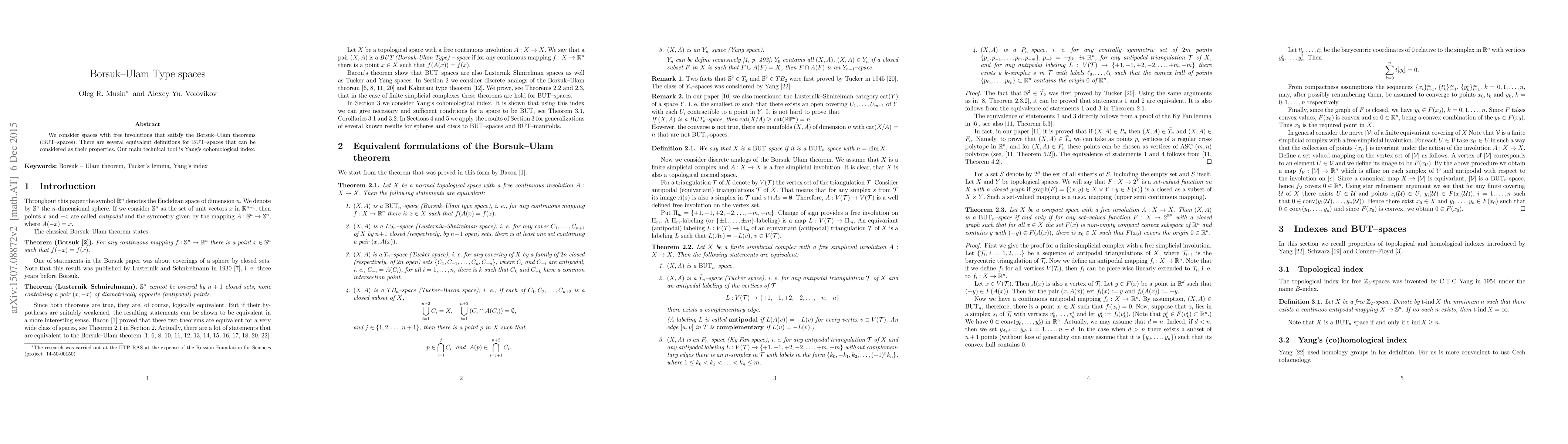 This research investigates spaces with free involutions adhering to the Borsuk-Ulam theorems, termed BUT-spaces, utilizing Yang's cohomological index as a key analytical tool to explore their various defining properties.