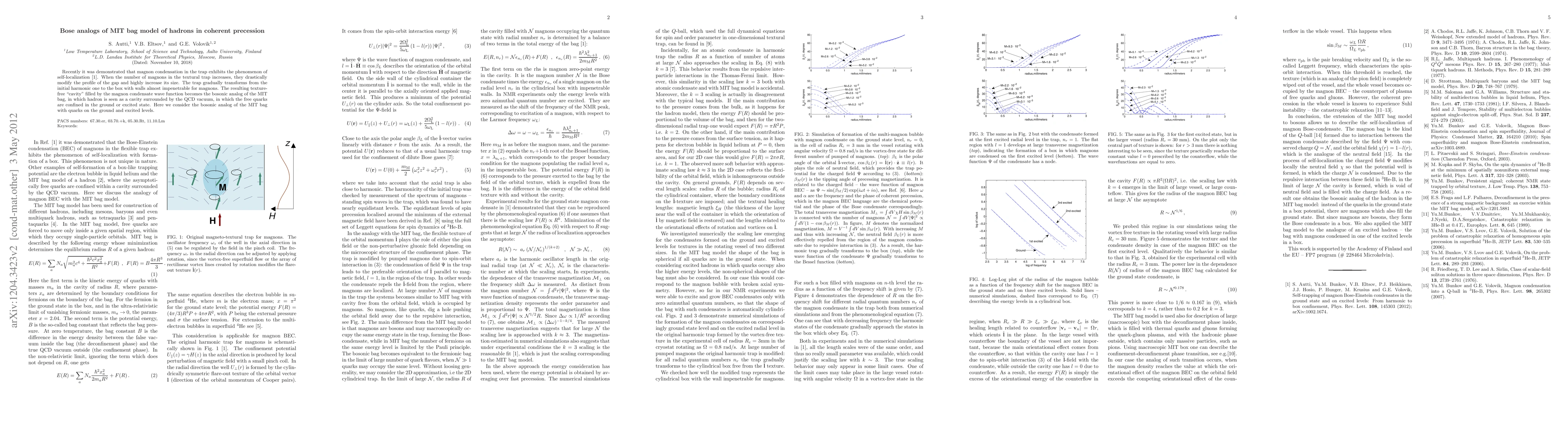 This paper explores the bosonic analog of the MIT bag model for hadrons, where magnon condensation in a trap leads to self-localization and a transformation of the trap into a texture-free cavity filled by a magnon condensate, analogous to the QCD vacuum confining quarks in a hadron. The study considers both ground and excited states of quarks within this bosonic MIT bag framework.