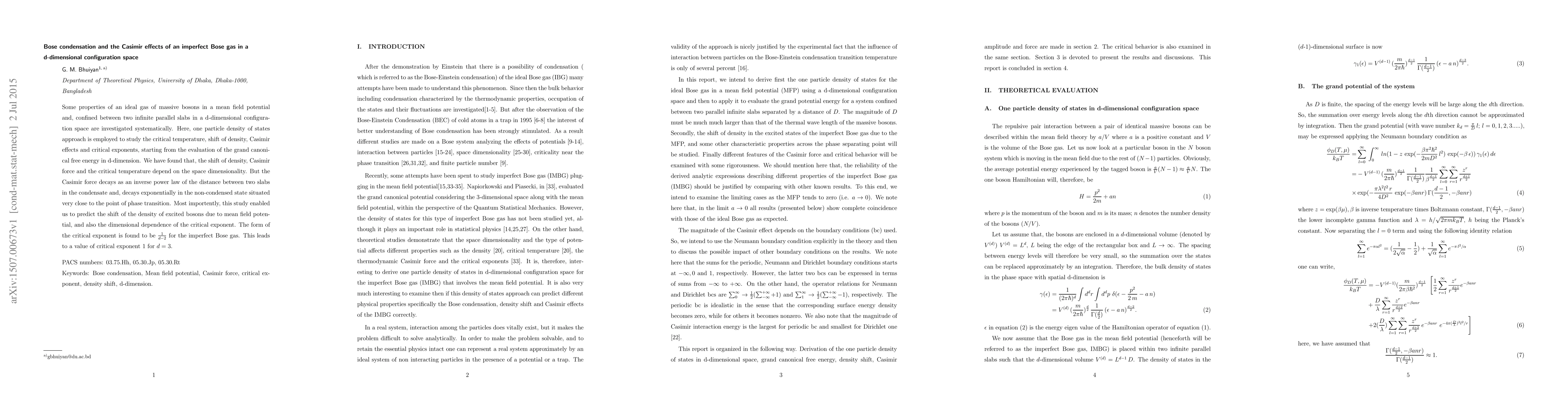 Some properties of an ideal gas of massive bosons in a mean field potential and, confined between two infinite parallel slabs in a d-dimensional configuration space are investigated systematically. Here, one particle density of states approach is employed to study the critical temperature, shift of density, Casimir effects and critical exponents, starting from the evaluation of the grand canonical free energy in d-dimension. We have found that, the shift of density, Casimir force and the critical temperature depend on the space dimensionality. But the Casimir force decays as an inverse power law of the distance between two slabs in the condensate and, decays exponentially in the non-condensed state situated very close to the point of phase transition. Most importently, this study enabled us to predict the shift of the density of excited bosons due to mean field potential, and also the dimensional dependence of the critical exponent. The form of the critical exponent is found to be $\frac{1}{d-2}$ for the imperfect Bose gas. This leads to a value of critical exponent $1$ for $d=3$.