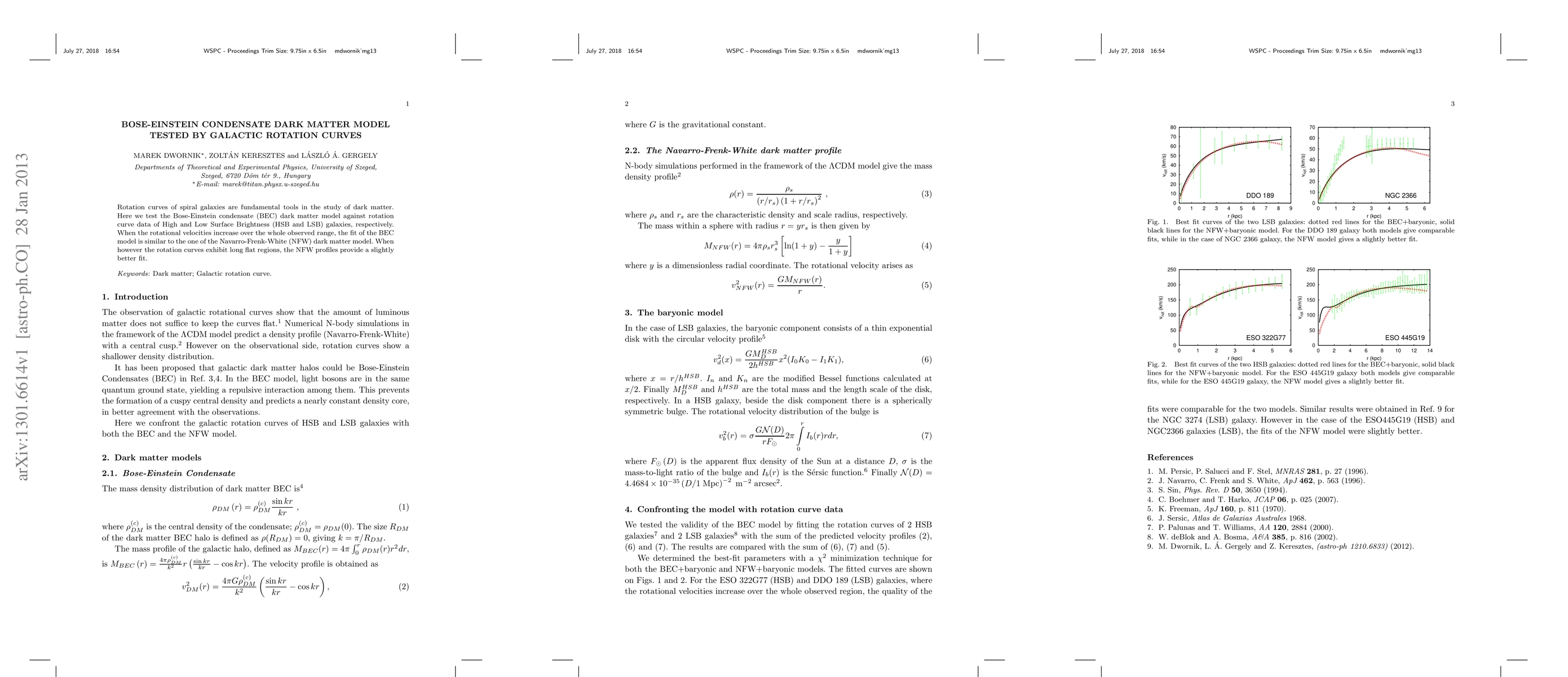 This paper tests the Bose-Einstein condensate (BEC) dark matter model against galactic rotation curves, finding it comparable to the Navarro-Frenk-White (NFW) model for increasing rotational velocities, but the NFW model slightly better fits long flat regions in rotation curves.