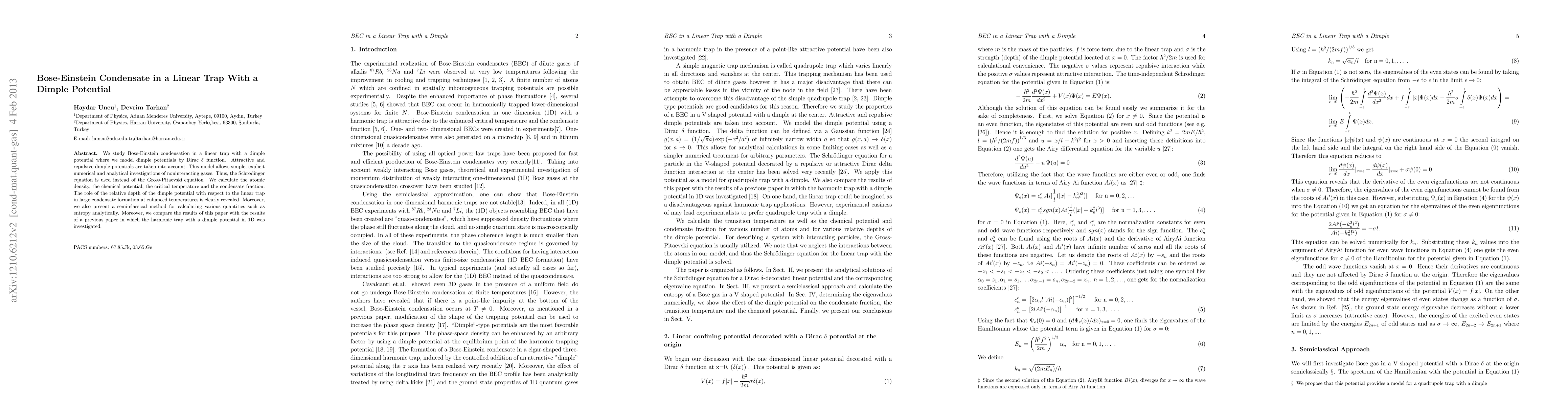 This paper investigates Bose-Einstein condensation in a linear trap with a dimple potential modeled by a Dirac delta function, focusing on both attractive and repulsive dimples. It employs the Schrödinger equation for noninteracting gases, calculating atomic density, chemical potential, critical temperature, and condensate fraction, and reveals the impact of dimple depth on condensate formation at elevated temperatures.